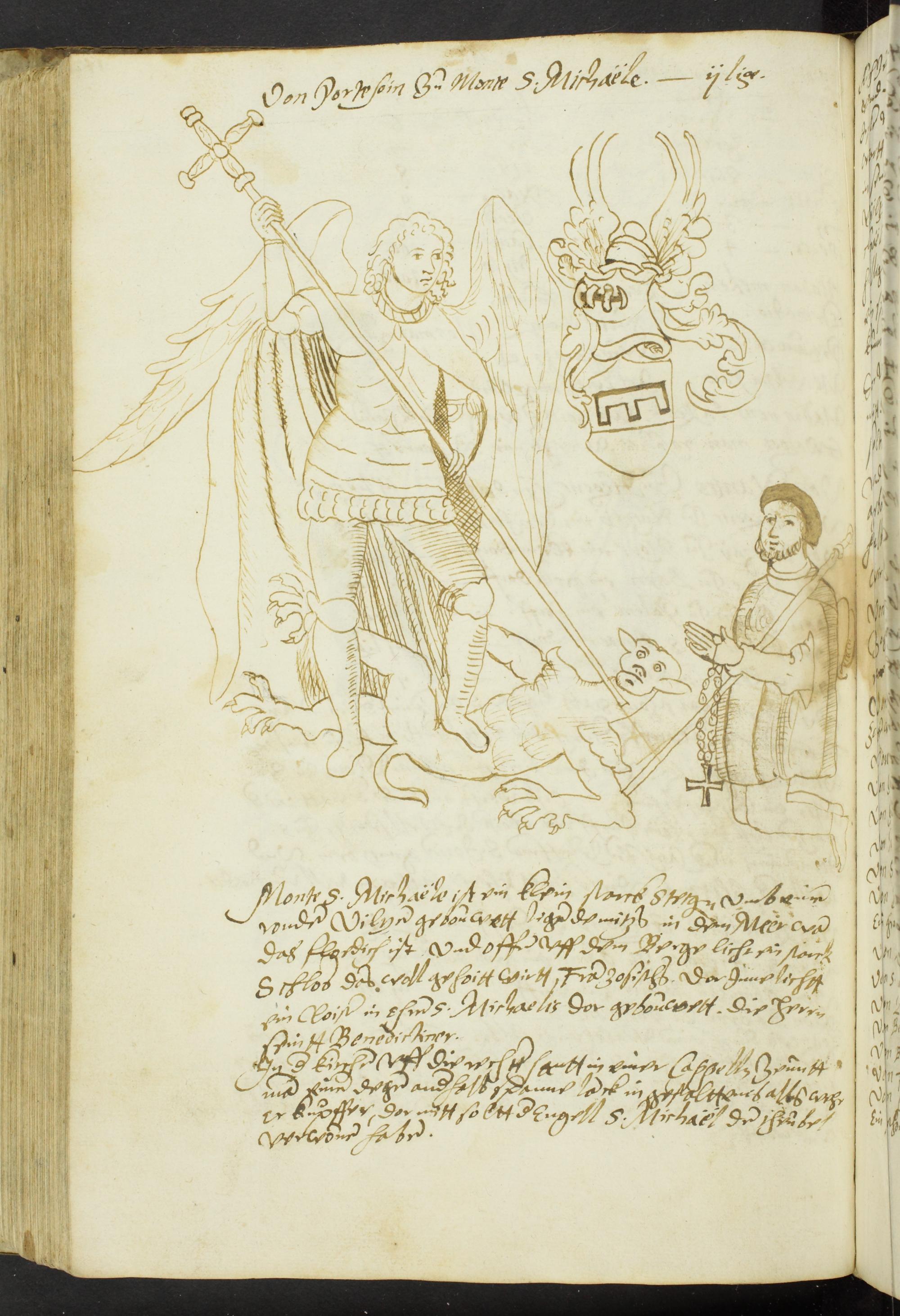 146v Illustration: Mont S. Michel (Arnold von Harff vor dem Engel S. Michael, der den Teufel besiegt)
