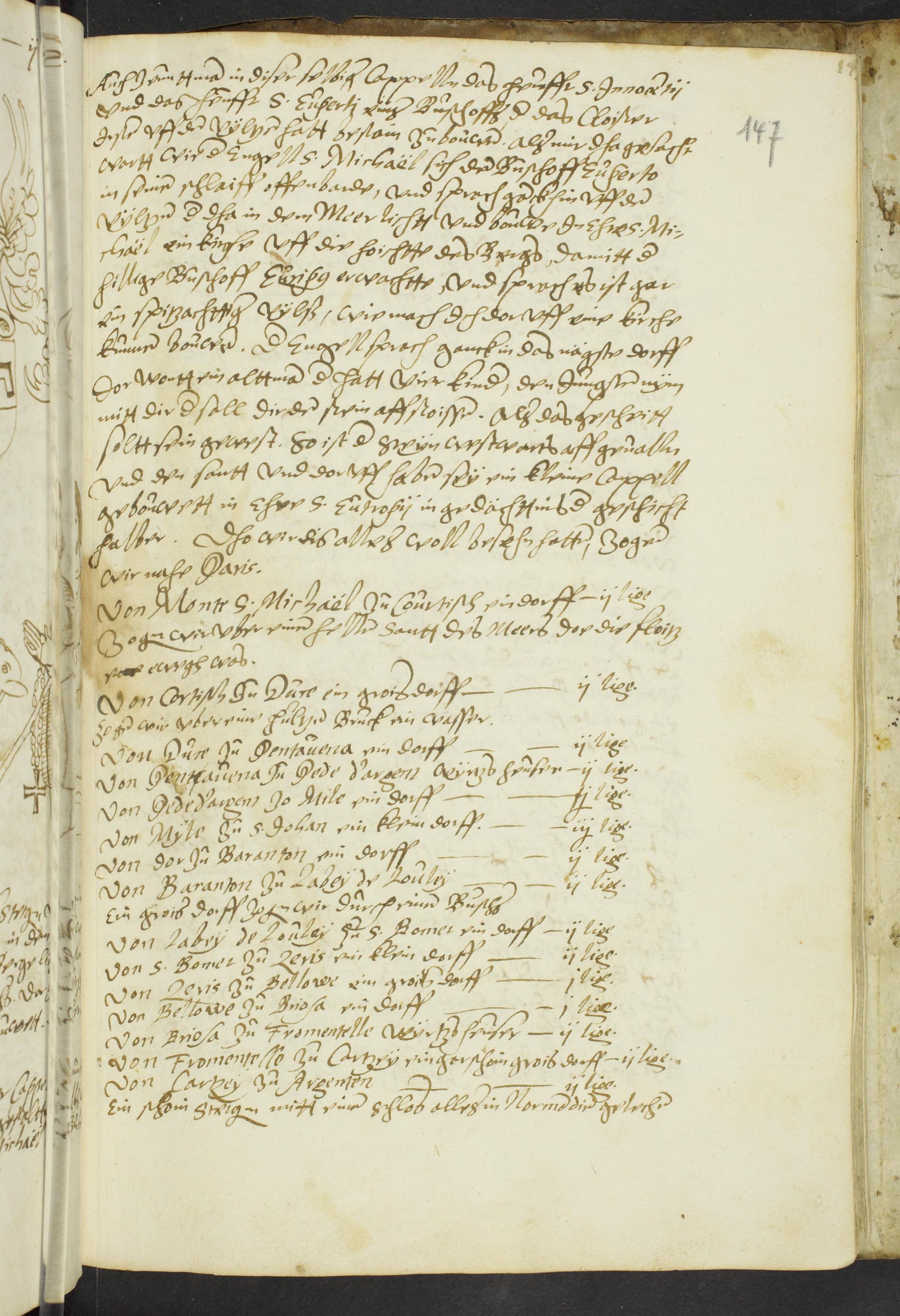 146v Illustration: Mont S. Michel (Arnold von Harff vor dem Engel S. Michael, der den Teufel besiegt)