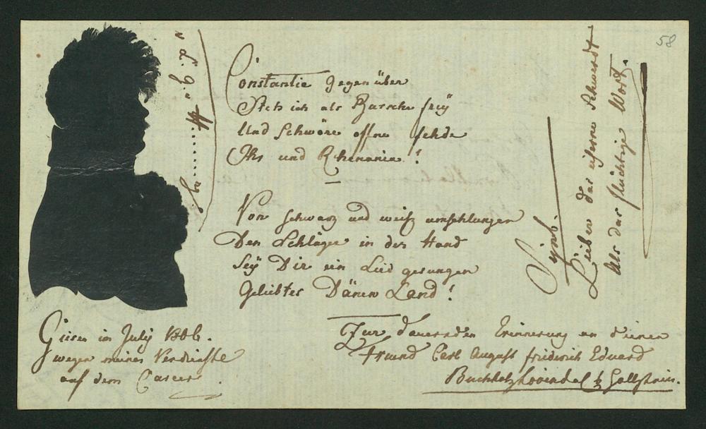 UB Gießen, Hs NF 802 - Album amicorum - Stammbuch. - UB Gießen, Hs NF 802 : Stammbuchkassette mit lose eingelegten Blättern des Gießener Studenten Carl Ludwig Kuder [aus dem Corps Franconia?]