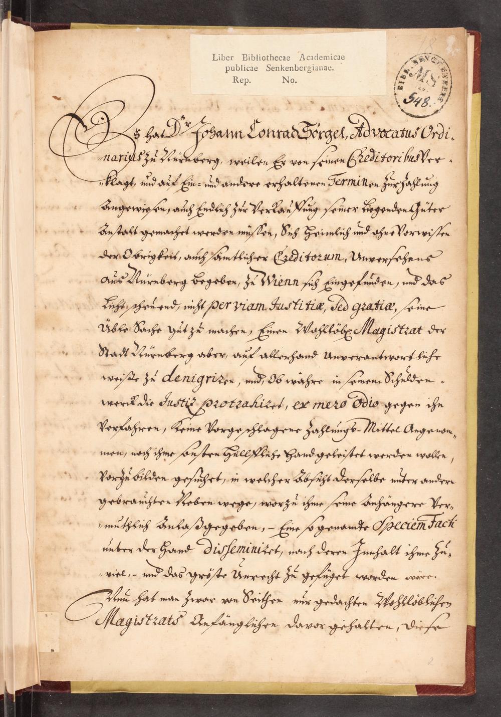 UB Gießen, Hs 1204 - Des Wohllöblichen Magistrats zu Nürnberg Ableitung gegen die bei K.[aiserlicher] M.[aiestät] vorgebrachten Gravamina und Imputationes des Advocaten Johann Conrad Sörgel, c. act. prob. - UB Gießen, Hs 1204