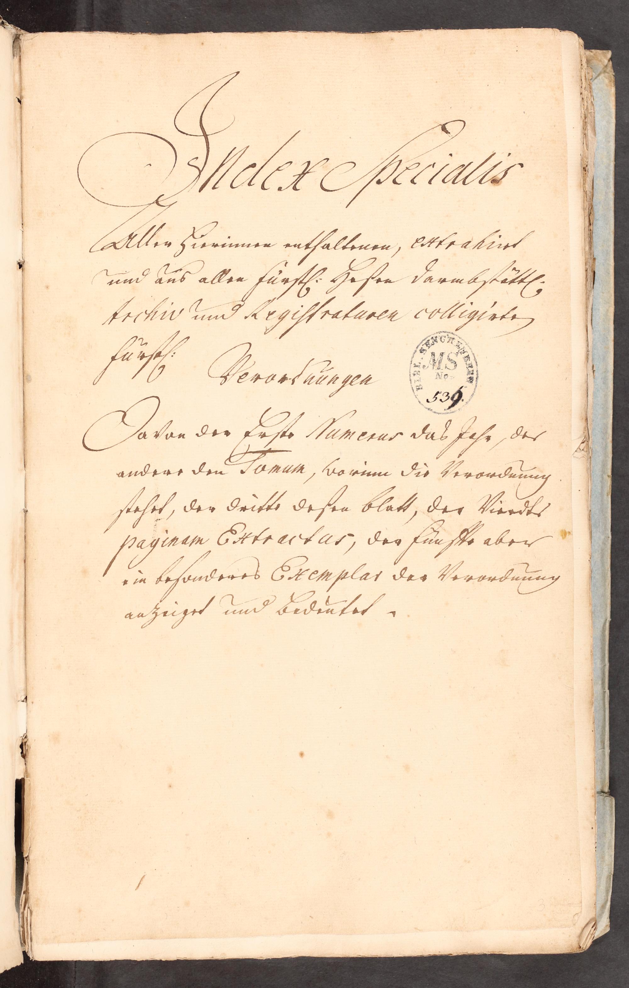 UB Gießen, Hs 1025 - Index specialis aller hierinnen enthaltenen, extrahirt und aus allen fürstl. Hessen Darmbstätt. Archiv und Registraturen colligirten furstl. Verordnungen. - UB Gießen, Hs 1025 : Acta S.C.R.; Abschriften von Verordnungen ca. der Jahre 1550-1784