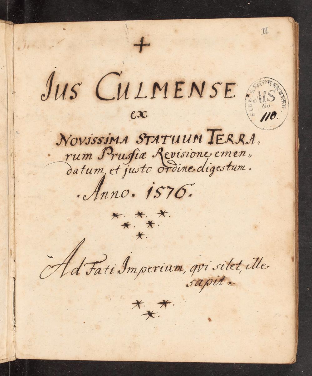 UB Gießen, Hs 1041 - Jus Culmense ex novissima statuum terrarum Prussiae revisione emendatum et justo ordine digestum. Anno 1576. - UB Gießen, Hs 1041