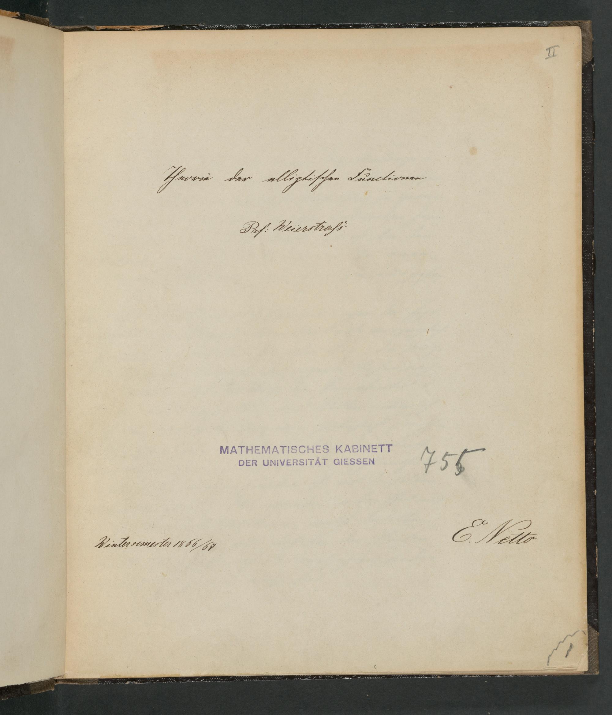 UB Gießen, Hs NF 708 - Theorie der elliptischen Functionen [nach] Weierstraß. - UB Gießen, Hs NF 708
