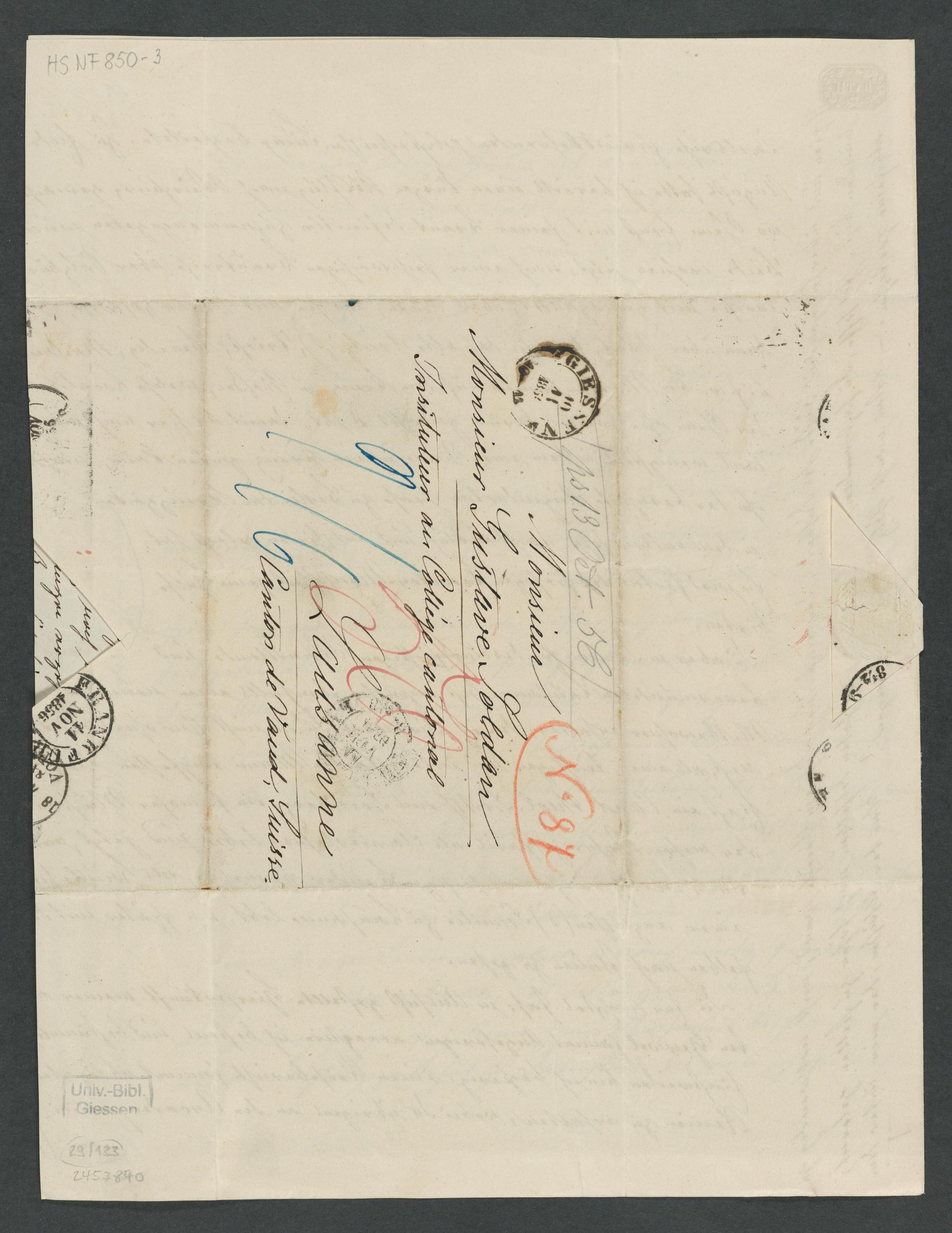 UB Gießen, Hs NF 850 - [3 eigenhändige Briefe mit Unterschrift]. - UB Gießen, Hs NF 850 / W.G. Soldan ; [adressiert an] Monsieur Gustav Soldan