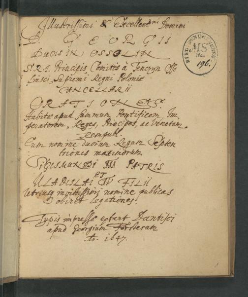 UB Gießen, Hs 195 - Illustriss. et excellent. D. Georgii Ducis in Ossolin S. R. J. Principis Comitis a Tenczyn Ossolinsky, Supr. Regni Poloniae Cancellarii Orationes : habitae apud summ. Pontif., Imperat., Reges, Principes ac Rempubl. Venetam, cum nomine ... Sigismundi III et Vladislai IV. publicas obiret legationes. - UB Gießen, Hs 195