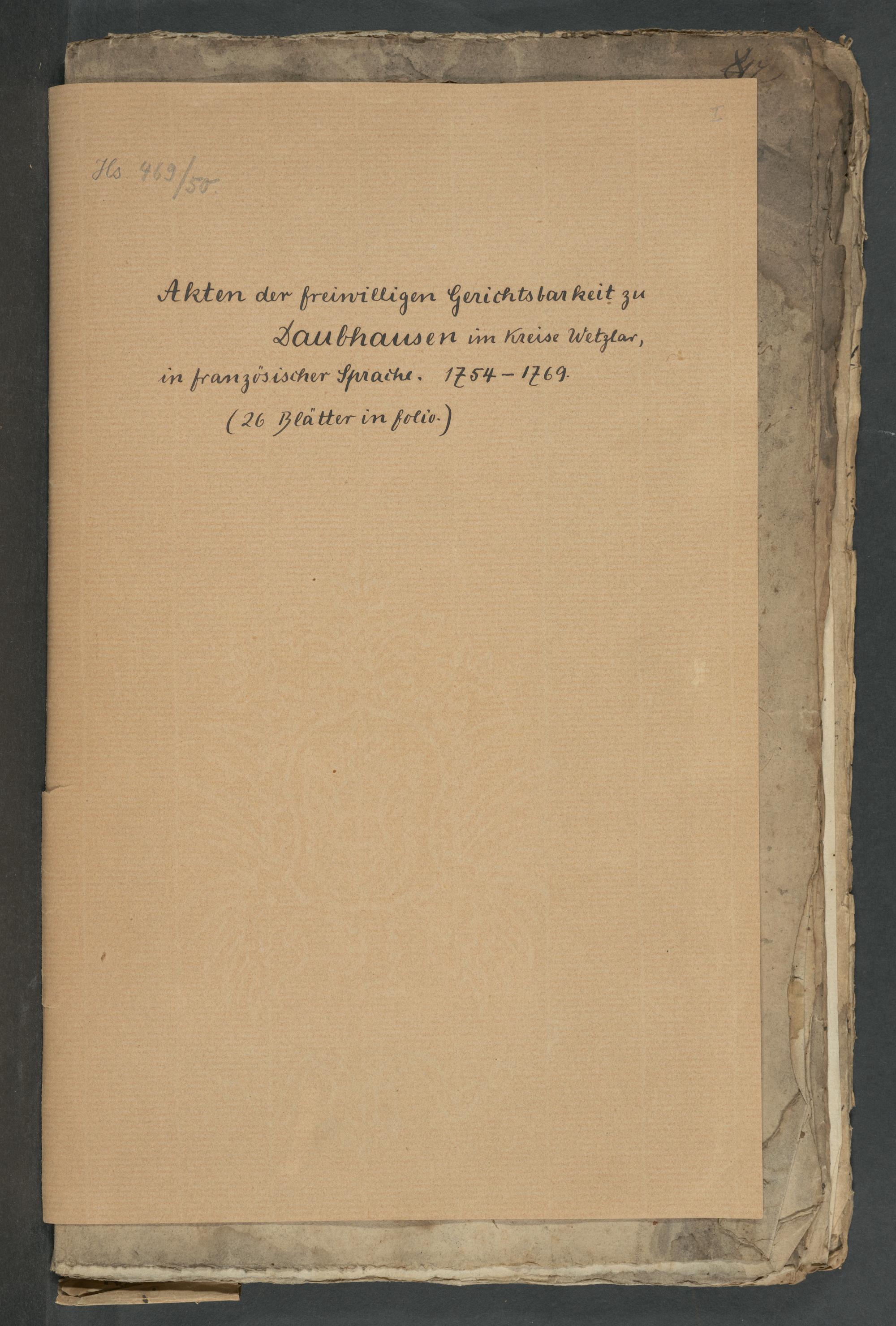 UB Gießen, Hs 469/50 - Akten der freiwilligen Gerichtsbarkeit zu Daubhausen im Kreis Wetzlar, in franzöischer Sprache : 1754-1769. - UB Gießen, Hs 469/50