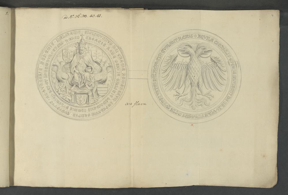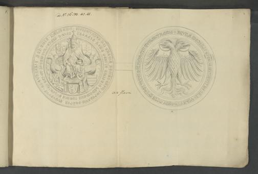 UB Gießen, Hs 172 - Sigilla : Sechs Querfolio-Blätter, enthaltend Handzeichnungen von Siegeln : zwei Blätter in 4. enthaltend in Kupfer gestochene Siegel. - UB Gießen, Hs 172