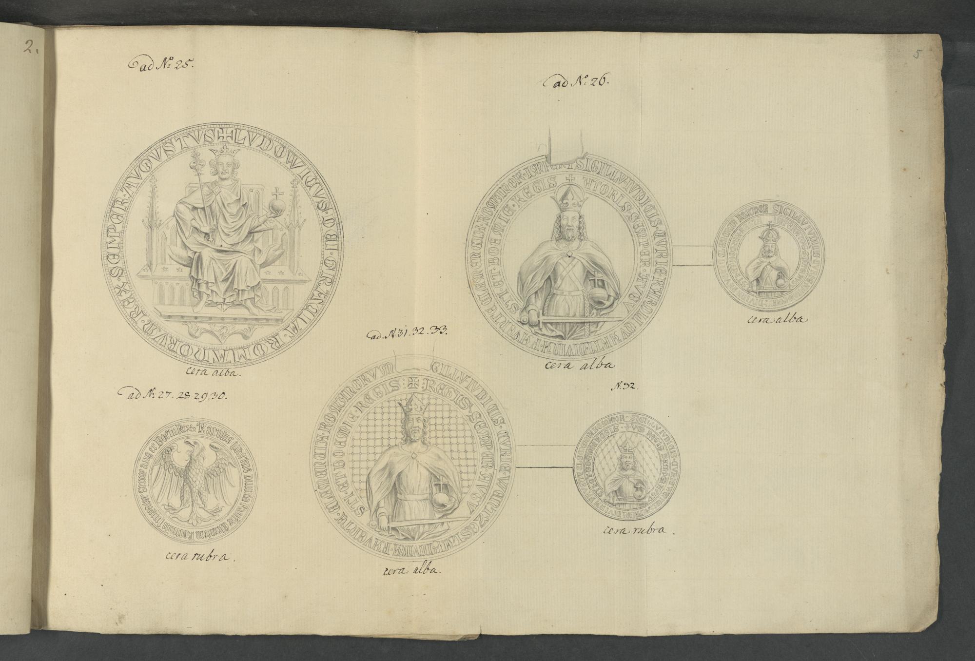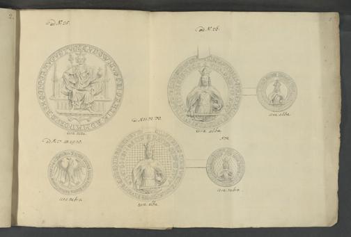UB Gießen, Hs 172 - Sigilla : Sechs Querfolio-Blätter, enthaltend Handzeichnungen von Siegeln : zwei Blätter in 4. enthaltend in Kupfer gestochene Siegel. - UB Gießen, Hs 172
