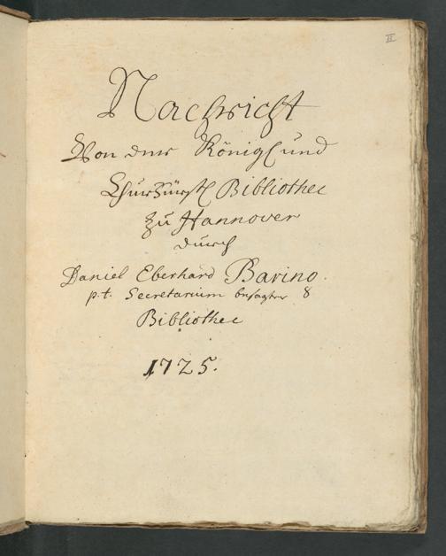 UB Gießen, Hs 27 - Nachricht von der Königl. und Churfurstl. Bibliothek zu Hannover. - UB Gießen, Hs 27 / durch D. E. Baring, p. t. Secretarium besagter Bibliothec. 1725