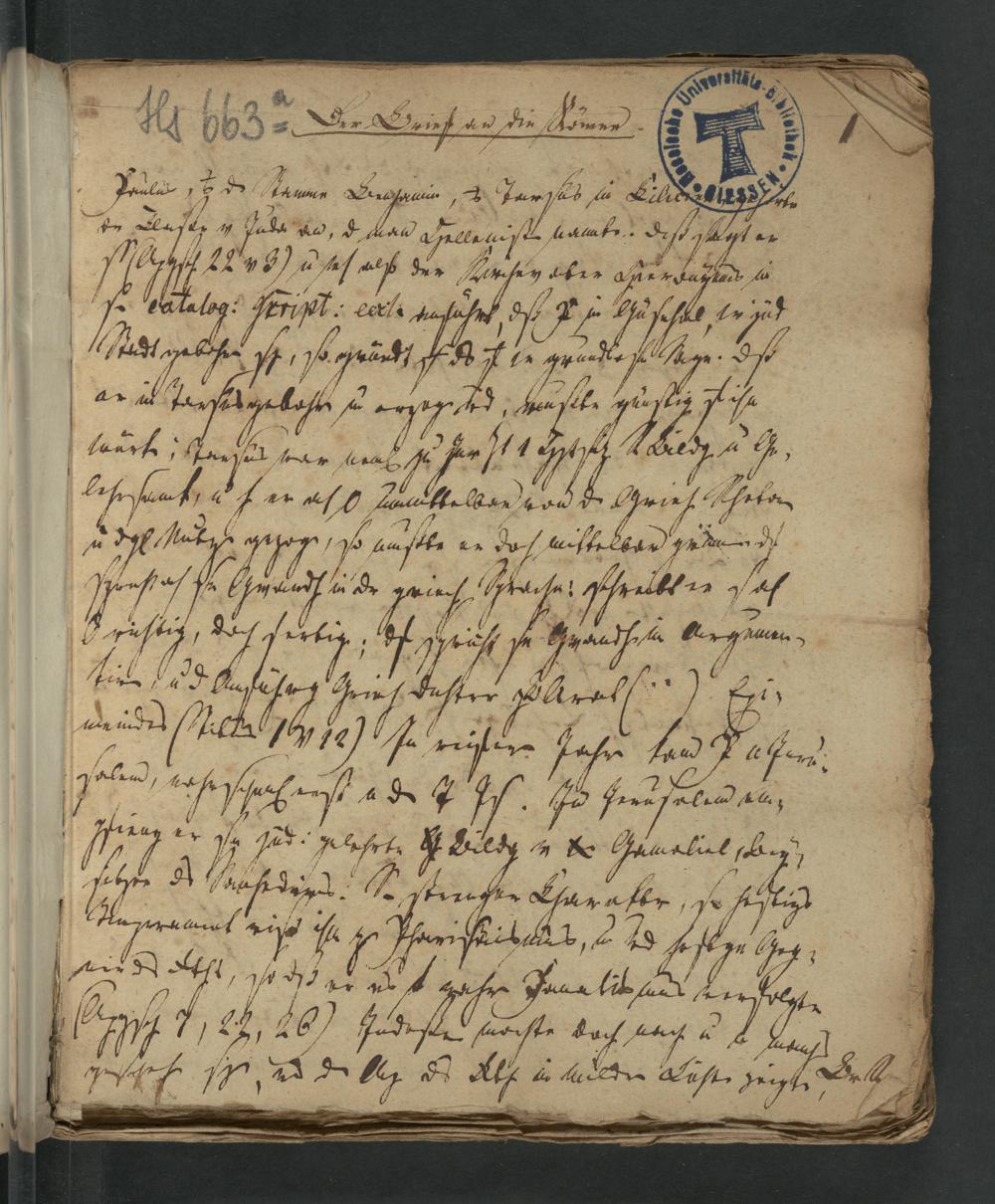 UB Gießen, Hs 663a - Der Brief an die Römer erklärt : WS 1814/15 : Kollegheft. - UB Gießen, Hs 663a / Ludwig Adam Dieffenbach ; nachgeschrieben von stud. theol. Wilhelm Eckstein, Giessen immatr. 23. Sept. 1813