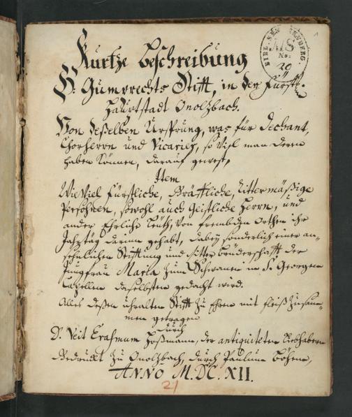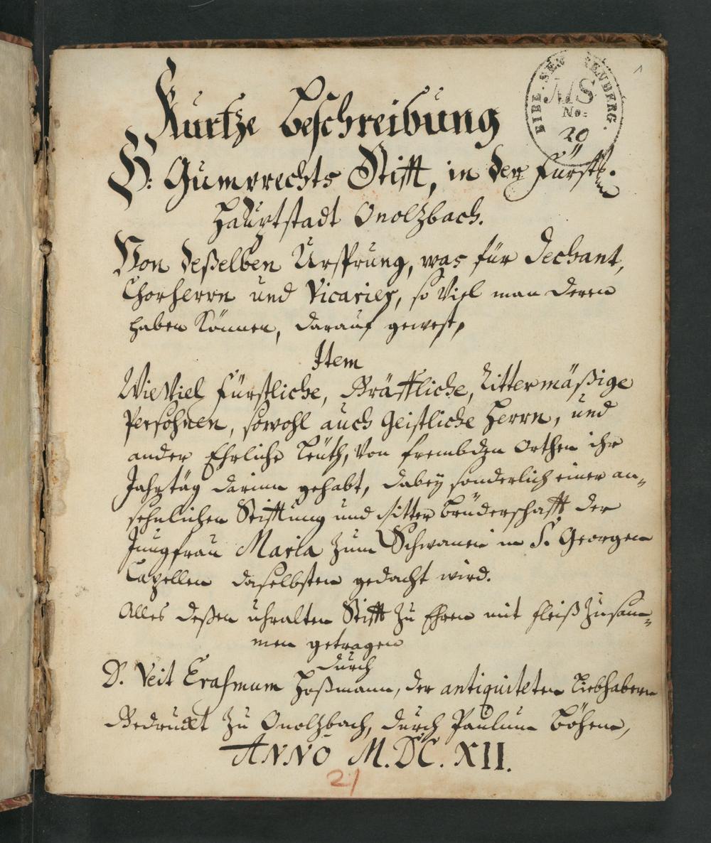 UB Gießen, 537 - Kurze Beschreibung H. Gumprechts Stiffts, in der furstl. Hauptstadt Onolzbach. - UB Gießen, 537 / Durch Veit Erasmus Hossmann, der Antiquitaeten Liebhabern ; Gedruckt zu Onolsbach durch Paul. Böhem. 1612
