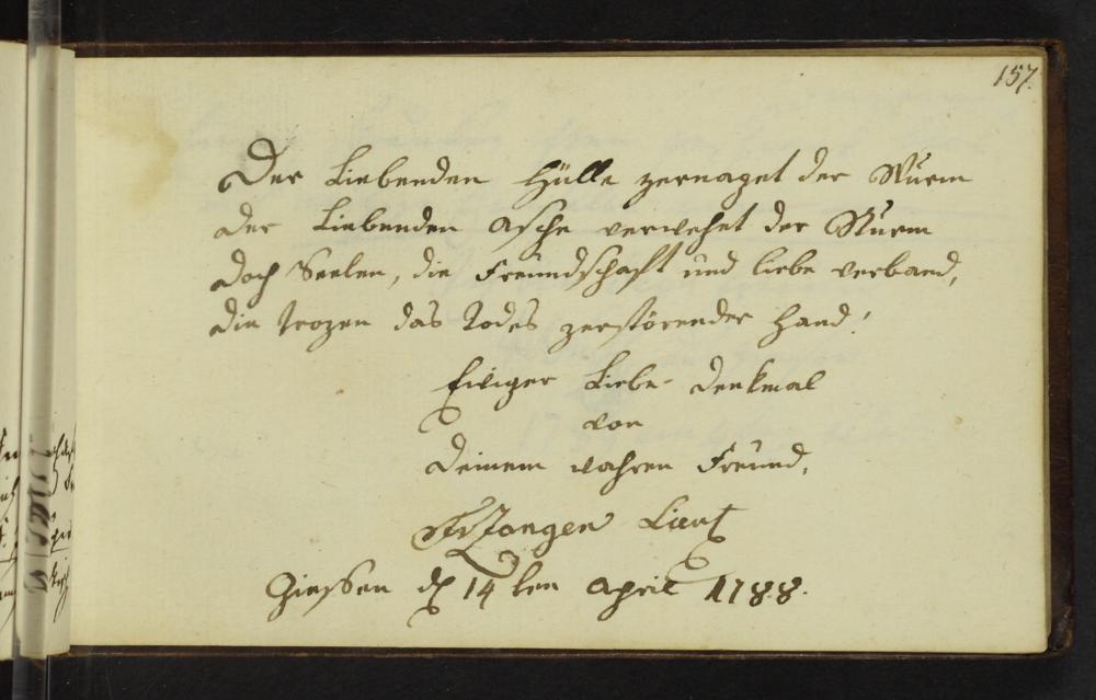 UB Gießen, Hs NF 776 - Album amicorum : Gönnern und Freunden gewidmet ; Gießen (überwiegend), Göttingen und Marburg, 1786 - 1795 / Freundschaftsalbum des Johann Balthasar Wortmann