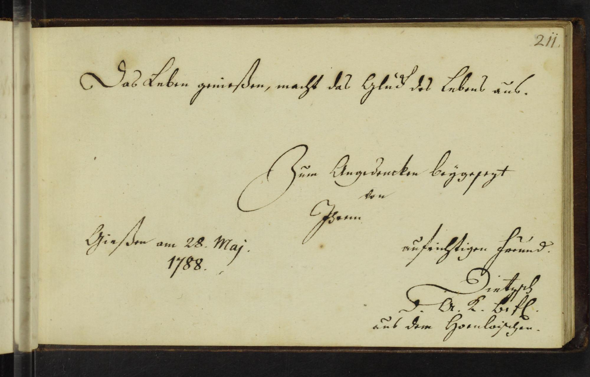 UB Gießen, Hs NF 776 - Album amicorum : Gönnern und Freunden gewidmet ; Gießen (überwiegend), Göttingen und Marburg, 1786 - 1795 / Freundschaftsalbum des Johann Balthasar Wortmann