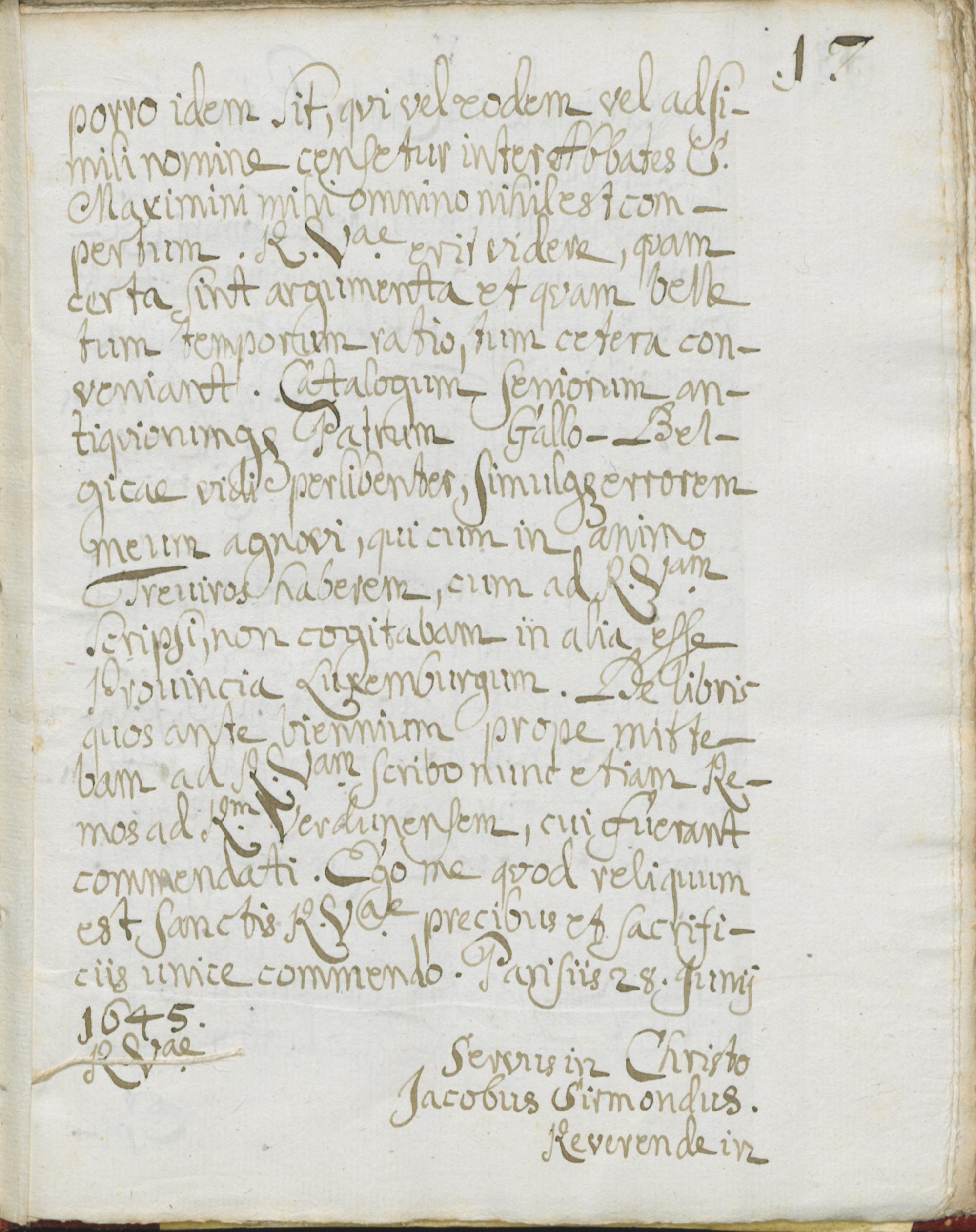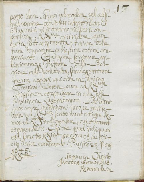 UB Gießen, Hs 126 - Jacobi Sirmondi Litterae ad P. Alexandrum Wilthemium Jesuitam ab originalibus desumptae, quae fuerant in manibus b. Schannati. - UB Gießen, Hs 126 : Briefe von Jacques Sirmond an Alexander Wiltheim (15 Nummern) in Abschrift