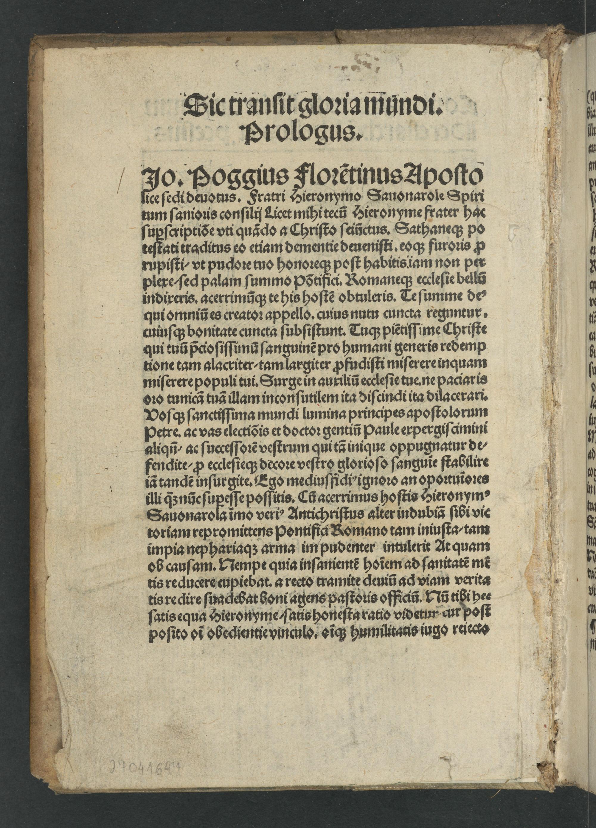 Jo.Poggius Floꝛẽtinus Apoſto Nie ſedi deuotus. Fratri Hieronymo Sauonarole Spiri tum ſanioꝛs conſilij Licet mihi tecũ Hieronyme frater hae ſupſcriptise vti quãdo a Chriſto ſciũctus. Sathaneq; po baſkate traditus eo etiam dementie deueniſti. eoq; furoꝛis ꝓ rupiſti/ vt pudoꝛe tuo honoꝛeq; poſt habitis iam non per plexe/ſed palam ſummo Põtifici. Komaneqʒ eccleſie bellũ indireris. acerrimũq; te his hoſtẽ obtuleris. Teſumme de qui omniũ es creatoꝛ appello. cuius nutu cuncta reguntur. cuiuſq; bonitate cuncta ſubſiſtunt. Tuq; piẽtiſſ ime Chriſte qui tuũ pᷣcio ſiſſimũ ſanguinẽ pro humani generis redemp tione tam alacriter/ tam largiter ꝓfudiſti miſerere inquam miſerere populi tui. Surge in auxiliũ eccleſie tue.ne paciaris oꝛo tunicã tuã illam inconſutilem ita diſcindi ita dilacerari⸗ Voſq; ſanctiſſima mundi lumina principes apoſtolorum Petre. ac vas electiõis et doctoꝛ gentiũ Paule expergiſ cimini aliqñ/ ac ſucceſſoꝛẽ veſtrum quitã inique oppugnatur de⸗ fendite/ꝓ eccleſieqʒ decoꝛe veſtro glorio ſo ſanguie ſtabilire iã tandẽ inſur gite. Ego mediuſſidiꝰignoꝛo an opoꝛtuĩoꝛes illi qʒ nũeſi er ſſepoſſitis. Cũ acerrimus hoſtis Hieronym⸗ Sauonarola