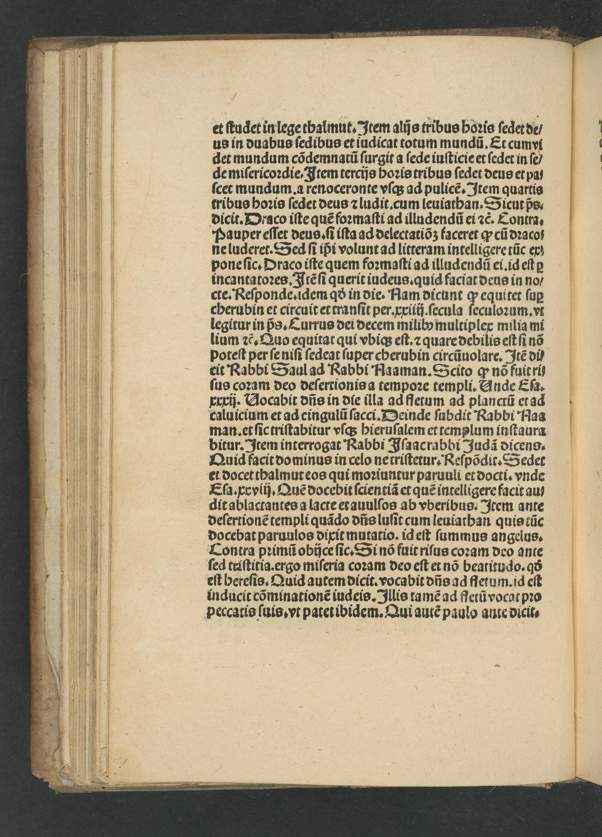 et ſtudet in lege thalmut. Item alijs tribus hoꝛis ſedet de⸗ us in duabus ſedibus et iudicat totum mundũ. Et cumvi det mundum cõdemnatũ ſurgit᷑ a ſede iuſticie et ſedet in ſe/ de miſericoꝛdie. Item tercijs hoꝛis tribus ſedet deus et pa⸗ ſcet mundum.a renoceronte vſq; ad pulicẽ. Item quartis tribus hoꝛis ſedet deus ⁊ ludit.cum leuiathan.Sicut ps. dicit. Draco iſte quẽ foꝛmaſti ad illudendũ ei ⁊c. Contra. Pauper eſſet deus.ſi iſta ad delectatiõʒ faceret ꝙ cũ dꝛaco⸗ ne luderet.Sed ſi ipᷣi volunt ad litteram intelligere tũc ex pone ſic. Draco iſte quem foꝛmaſti ad illudendũ ei.id eſt ꝑ incantatoꝛes. Itẽ ſi querit iudeus.quid faciat deus in no⸗ cte. Reſponde.idem qð in die. Ham dicunt ꝙ equitet ſuꝑ cherubin et circuit et tranſit per.xxiiij.ſecula ſeculoꝛum.vt