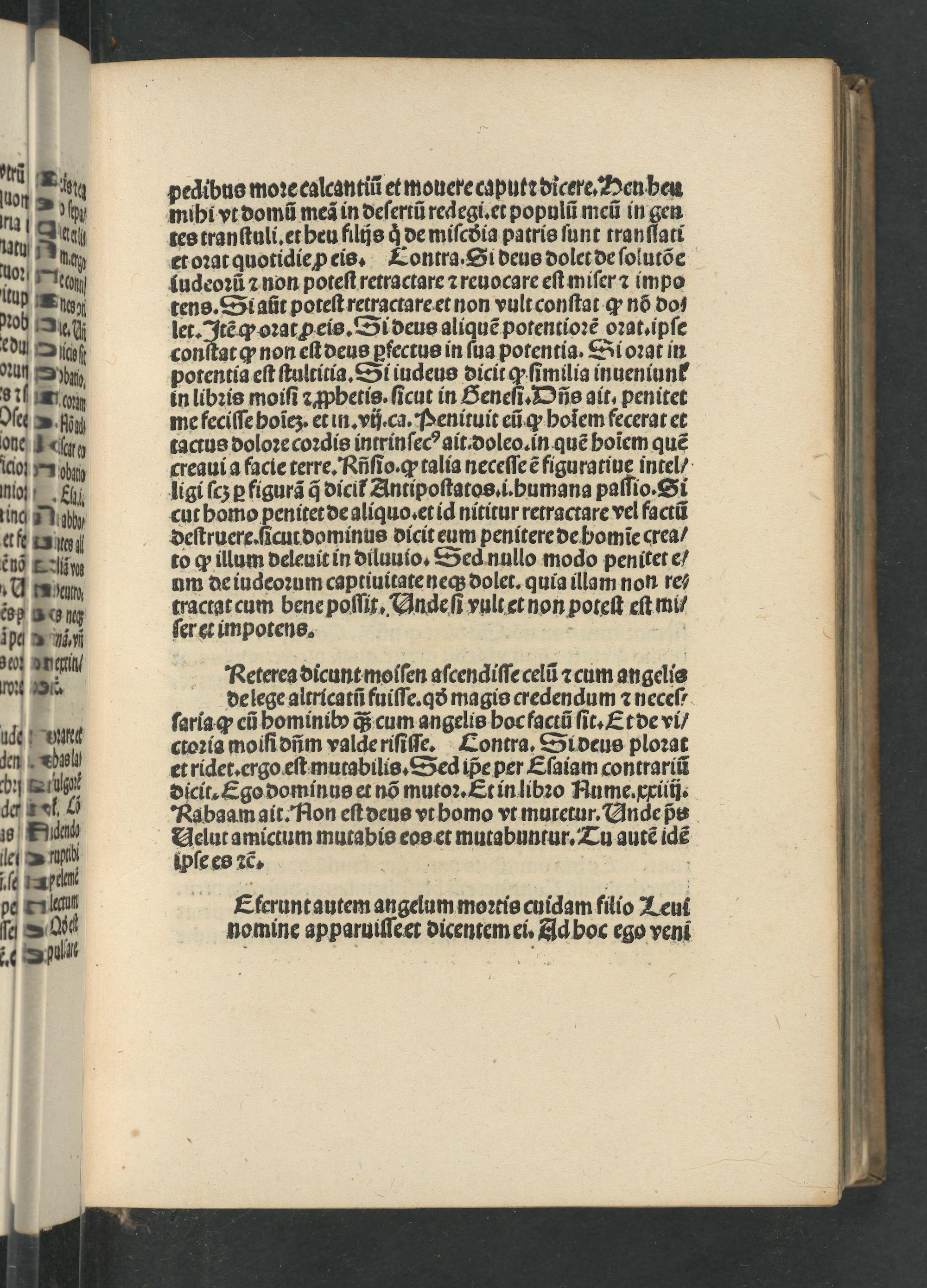iudeoꝛũ ⁊ non poteſt retractare ⁊ reuocare eſt miſer ⁊ impo tens. Si aũt poteſt retractare et non vult conſtat ꝙ nõ do⸗ let. Itẽ ꝙ oꝛat ꝓeis.Si deus aliquẽ potentioꝛẽ oꝛat.ipſe conſtat ꝙ non eſt deus ꝑfectus in ſua potentia. Si oꝛat in potentia eſt ſtultitia. Si iudeus dicit ꝙ ſimilia inueniunt᷑ in libꝛis moiſi ⁊ ꝓphetis.ſicut in Beneſi. Oñs ait.penitet me keciſſe hoĩez. et in. vij.ca. Penituit eũ ꝙ hoĩem fecerat et tactus doloꝛe coꝛdis intrinſecꝰ ait.doleo.in quẽ hoĩem quẽ