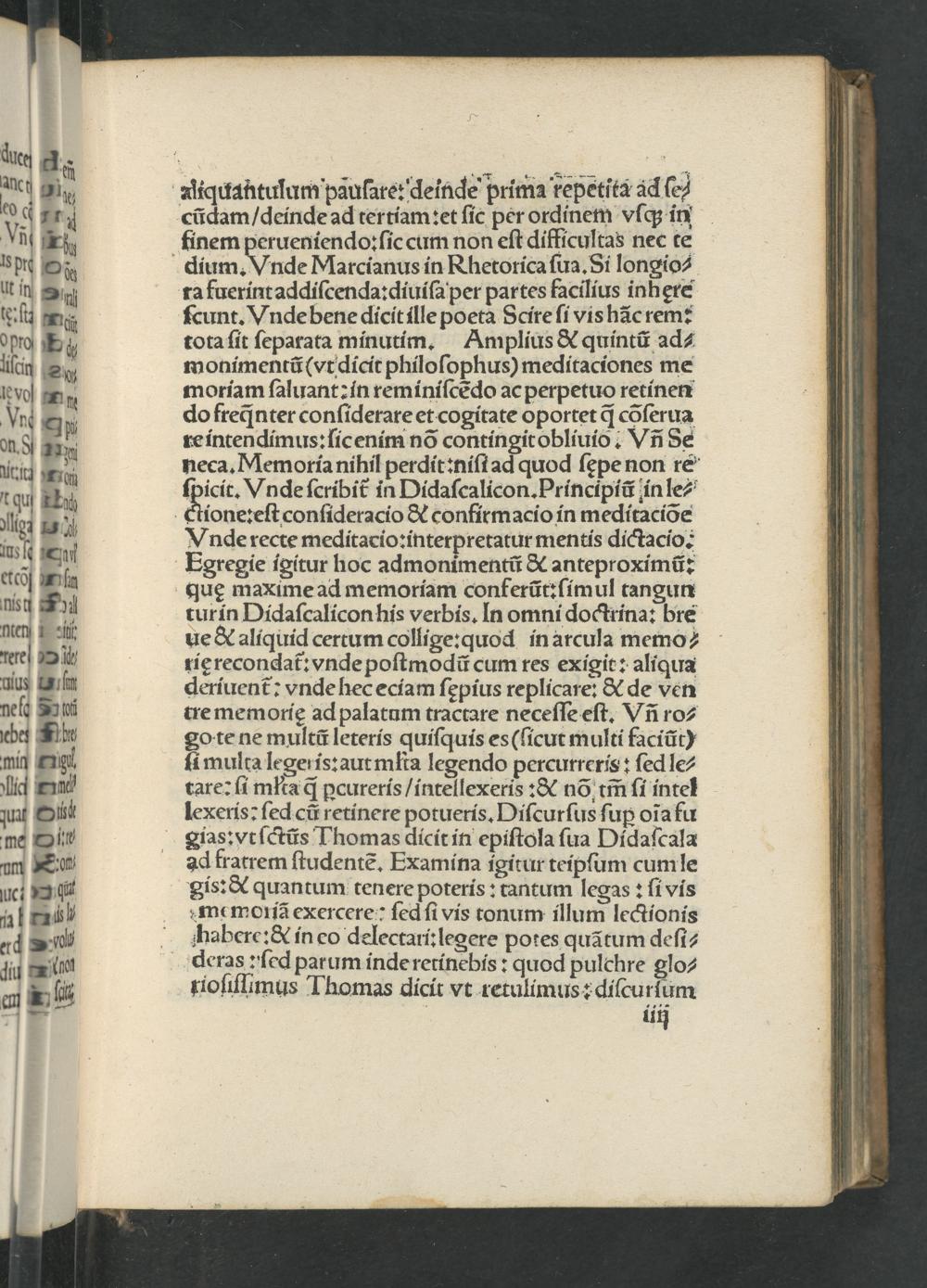 turin Didaſcalicon his verbis. In omni doctrina: bre ue& aliquid certum collige:quod in arcula memo? rię recondat᷑: vnde poſtmodũ cum res exigit: aliqua deriuent: vnde hec eciam ſępius replicare:& de ven tre memorię ad palatum tractare neceſſe eſt. Vñ ro⸗ go te ne multũ leteris quiſquis es(ſicut multi faciũt) ſi multa legeris: aut mfta legendo percurreris: ſed le⸗ tare: ſi mta qᷓ ꝑcureris/ intellexeris:& nõ tm̃ ſi intel lexeris: ſed cũ retinere potueris. Diſcurſus ſuꝑp oĩa fu gias:vt ſctũs Thomas dicit in epiſtola ſua Didaſcala ad fratrem ſtudentẽ. Examina igitur teipſum cum le gis:& quantum tenere poteris: tantum legas: ſi vis memoriã exercere: ſed ſi vis tonum illum lectionis habere:& in eo delectari:legere potes quãtum deſi⸗ deras ſed parum inde retinebis: quod pulchre glo⸗ rioſiſlimus Thomas dicit vt retulimus: diſcurſum