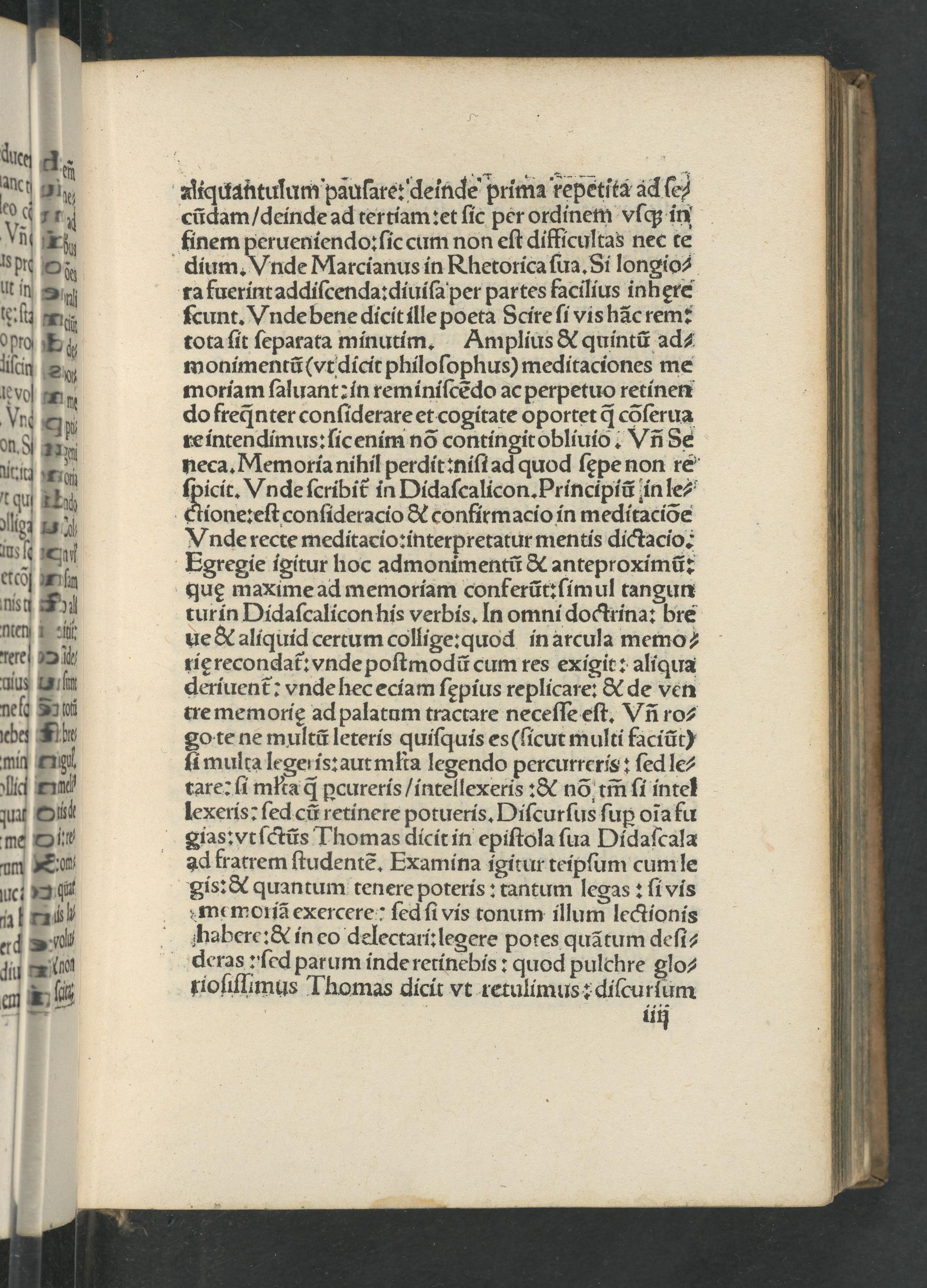 .„ 4r„.„7 Aiquantulum pauſare: deinde prima repetita ad ſe⸗ cũdam/ deinde ad tertiam:et ſic per ordinem vſq; in finem perueniendo: ſic cum non eſt difficultas nec te dium. Vnde Marcianus in Rhetorica ſua. Si longio⸗ ra fuerint addiſcenda:diuiſa per partes facilius inhęre ſcunt. Vnde bene diccit ille poeta Scire ſi vis hãc rem: tota ſit ſeparata minutim. Amplius& quintũ ad⸗ monimentũ(vt dicit philoſophus) meditaciones me moriam ſaluant: in reminiſcẽdo ac perpetuo retinen do freq̃nter conſiderare et cogitate oportet ꝗᷓ cõſerua re intendimus: ſic enim nõ contingit obliuio. Vñ Se neca. Memoria nihil perdit:niſt ad quod ſępe non re ſpicit. Vnde ſcribit᷑ in Didaſcalicon. Principiũ in le⸗ Sontreitcolleroct& confirmacio in meditaciõe Vnde recte meditacio:interpretatur mentis dictacio. Egregie igitur hoc admonimentũ& anteproximũ: quę maxime ad memoriam conferũt:ſimul tangun