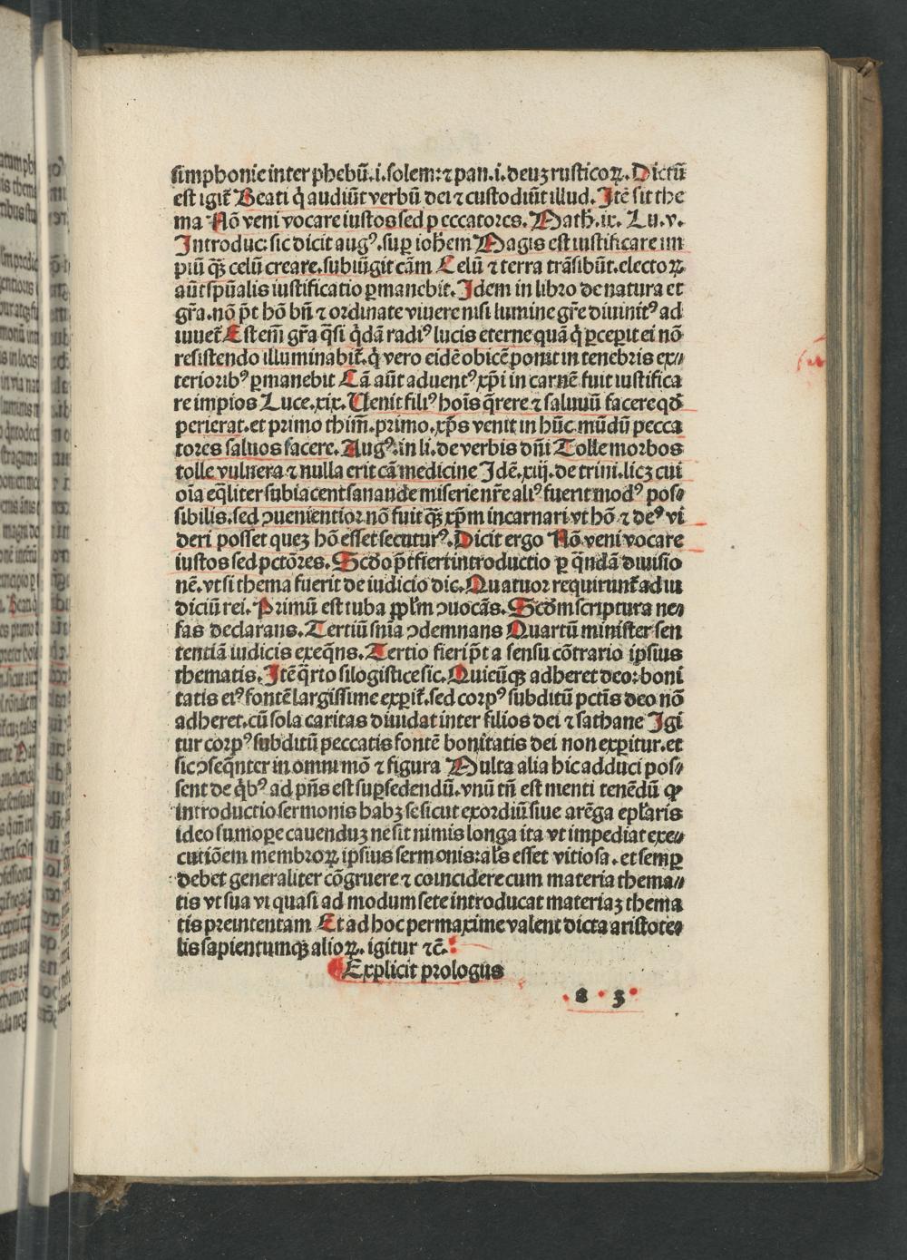 deri poſſet quez hõ eſſer ſecururꝰ. Dicit ergo Hõ veni vocare iuſtos ſed pctõꝛes. Gcðo pᷣtfiertintroductio ꝑ qᷓndã dmiſio nẽ. vt ſi thema fuerit de iudicio dic. Quatuoꝛ requiruntadiu diciũ rei. Pꝛimũ eſt tuba plm ↄuocãs. Beðm ſcnptura ne⸗ fas declaraus. Tertiũ ſnia ↄdemnans Quartũ miniſter ſen tentiã iudicis exeq̃ns. Tertio fieripᷣt a ſenſu cõtrario ipſius whematis. Itẽ q̃rto ſilogiſticeſic. Quieũq; adheret deo:boni tatis eiꝰ fontẽ largiſſime exꝑit᷑.ſed coꝛpꝰ ſubditũ pctĩs deo nõ adheret.cũ ſola caritas diuidat inter filios dei ⁊ ſathane Igi tur coꝛp ſubditũ peccatis fontẽ bonitatis dei non expitur.et ſicoſeqnter in omm mõ ⁊ figura Dulta alia hicadduci poſ⸗ ſent de qbꝰ ad pñs eſt ſuꝑſedendũ.vnũ tñ eſt menti tenẽdũ ꝙ introductio ſermonis babʒz ſeſicut exoꝛdiũ ſiue arẽga epłaris ideo ſumopꝑecauenduz neſit nimis longa ita vt impediatexe⸗ cutiõem membꝛoꝝ ipſius ſermonis:als eſſet vitioſa. etſemꝑ debet generaliter cõgruere ⁊ coinciderecum materia thema⸗ tis vt ſua vi quaſi ad modum ſete introducat materiaʒ thema tis pꝛeintentam Etad hoc permaxime valent dicta ariſtote⸗ lis ſapientumq; alioꝝ.igitur ꝛc-ꝙ¼¼. ESEExplicit pꝛologus
