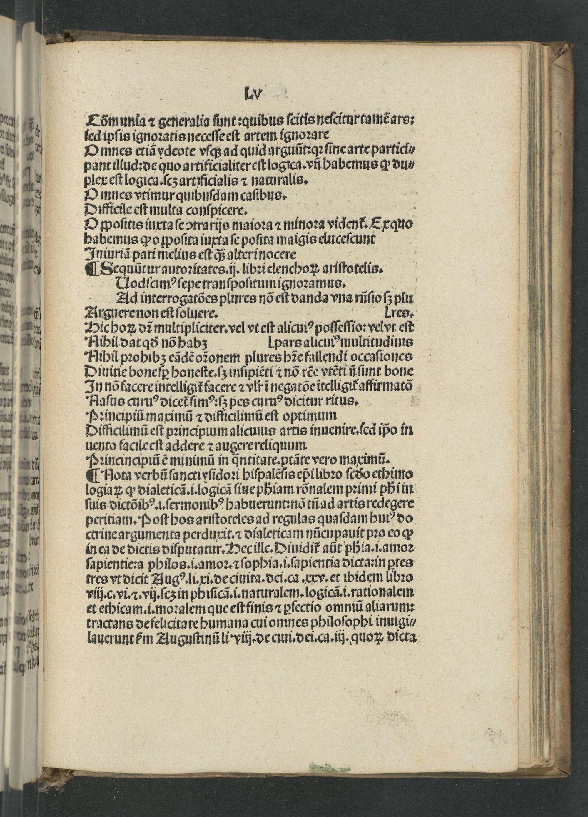 ¶ Hota verbũ ſanctivſidoꝛi hiſpalẽſis epilibꝛo ſcðo ethimo logiaꝝ ꝙ dialeticã.i.logicã ſiue phᷣiam rõnalem pꝛimi phiin ſuis dictõibꝰ.i.ſermonibꝰ habuerunt:nõ tñ ad artis redegere peritiam. Poſt hos ariſtoreles ad regulas quaſdam huiꝰ do ctrine argumenta perduxit.⁊ dialeticam nũcupauit pꝛo eo ꝙ in ea de dicris diſputatur. Hec ille. Diuidit᷑ aũt phᷣia.i.amoꝛ ſapientie:a philos.i.amoꝛ.⁊ ſophia.i.ſapientia dicta:in ptes tres vt dicit Augꝰ.li.xi.de ciuita.dei.ca.xxv.et ibidem libꝛo viij.c. vi.z⁊.vij.ſcʒ in phiſicã.i.naturalem.logicã.i.rationalem et ethicam. i. moꝛalem que eſt finis ⁊ ꝑfectio omniũ aliarum: tractans defelicitate humana cui omnes philoſophi inuigio lauerunt Fm Auguſtinũ li · viij.de ciui.dei.ca.iij.quoꝝ. dicta