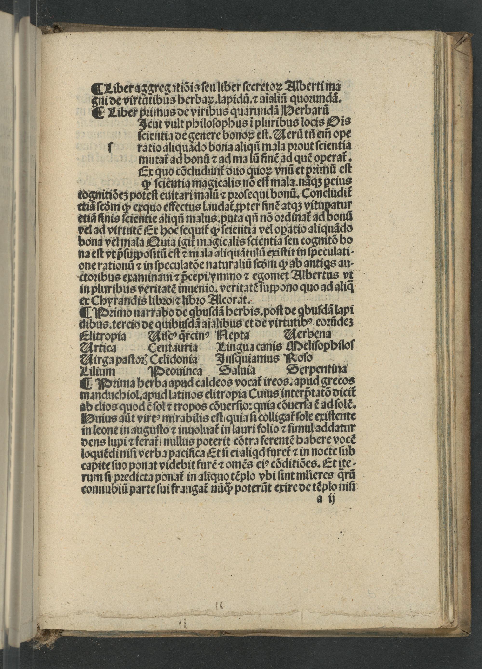 er Chyrandis libꝛo ⁊ libꝛo Alcorea. ¶ Wꝛimo narrabo de gbuſclã herbis. poſt de Tbnſd lapi dibus. tercio de quibuſda aialibus et de virtutibꝰ eoꝛũdez Elitropia ie drein Mepta Aerbena Artica Centauria Lingun canis Meliſophiloſ irgapaſtoꝛ Celidonia Juſquiamus Rolo