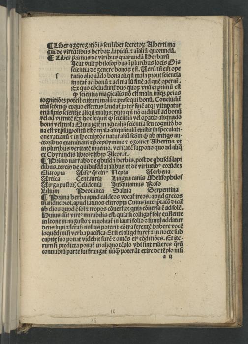 ¶ Pꝛima herba apud caldeos vocat᷑ ireos. apud grecos manduchiol.apud latinos elitropia Cuius interptatõ dicit ab clios quod ſol⁊ tropos cõuerſio:quia cõuerſa ẽ nd ſolẽ. Huius aut virt) mirabilis eſt quia ſi colligat ſole exiſtente in leone in anguſto ⁊ inuoluat᷑ in lauri folio ⁊ ſimul adctatur dens lupi ferat nullus poterit cõtra ferentẽ habere voc loquẽci niſi verba paciſica Et ſi eialiad furet᷑⁊ in nocte ſub capite ſuo ponat videbit furẽ ⁊ omẽs eiꝰ cõditiões.Et ite rum ſi pꝛedicta ponat᷑ in aliquo tẽplo vbi ſint mlieres qrũů connubiũ parte ſui frangat᷑ nãq́; poterũt exire de tẽplo niſi