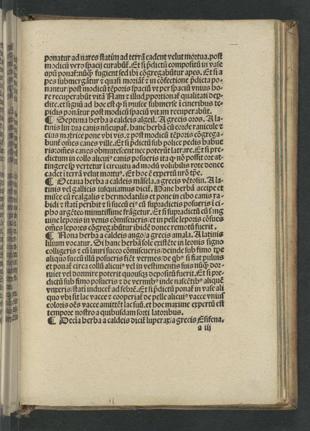 ponatur ad nares ſtatim ad terrã cadent velut moꝛtua. poſt modicũ vero ſpacij curabũt᷑. Et ſipᷣdictũ compoſitũ in vaſe apũ ponai:nuq́ fugient ſed ibi cõgregabũtur apes. Et ſia pes ſubmergãtur ⁊ quaſi moꝛiãt᷑ ꝛ in cõfectione pᷣdicta po. nantur /poſt modicũ tẽpoꝛis ſpaciũ vt per ſpaciũ vnius ho- re recuperabũt vitã Nam illud ꝓpoꝛtionat᷑ qualitati deꝑ- dite.et ſignũ ad hoc eſt ꝙ ſi muſce ſubmerſe ĩ cineribus te picis ponãtur poſt modicũ ſpaciũ vitam recuperabũt. ¶ Septima herba a caldeis algeil. A grecis oꝛos. Ala⸗ tinis lin zua canis nũcupat᷑. hanc herbã cũ coꝛde ranicule ⁊ eius matrice pone vbi vis.⁊ poſt modicũ tẽpoꝛis cõgrega- bunt omes canes ville. Et ſipᷣdictũ ſub police pedis habue ris:om̃es canes obmuteſcent nec poterũt latrare.ỹt ſipre- dictum in collo alicuiꝰ canis poſueris ita ꝙ nõ poſſit oꝛe at- tingere ſꝑ vertetur ĩ circuitu ad modũ volubilis rote donec cadet ĩterrã velut moꝛtuꝰ.Et hoc ẽ expertũ nrõ tᷣe. ¶ Octaua herba a caldeis mãſela. a grecis vẽtoſin. Ala- tinis vel gallicis iulauiamus dicit. Hanc herbã accipe et miſce cũ realgalis ⁊ hermodatilis et pone in cibo canis ra- bidi ſtati peribit⁊ ſi ſuccũ eiꝰ cũ ſupꝛadictis poſueris ĩ ci- pho argẽteo minutiſſime frãgetur. Et ſi ſupꝛadictũ cũ ſang uine lepoꝛis in venis cõmiſcueris/et in pelle lepoꝛis cõſues om̃es lepoꝛes cõgregabũtur ibidẽ donec remotũ fuerit. ¶ Mona herba a caldeis angoſa grecis amala. Alatinis lilium vocatur. Si hanc herbã ſole exiſtẽte in leonis ſigno colligeris ⁊ cũ lauri ſucco cõmiſcueris deinde ſub fimo tꝑe aliquo ſuccũ illũ poſueris fiẽt vermes de ꝗbo ſi ſiat puluis et ponat᷑ circa collũ alicuiꝰ vel in veſtimentis ſuis nũq́; doꝛ miet vel doꝛmire poterit quouſqʒ depoſitũ fuerit.Et ſi pꝛe- dictũ ſub fimo poſueris ⁊ de vermibꝰ inde naſcẽtibꝰ aliquẽ vnxeris ſtati inducet᷑ ad febꝛẽ.Et ſipᷣdictũ ponat᷑ in vaſe ali quo vbi ſit lac vacce ⁊ cooperiat᷑ de pelle alicuiꝰ vacce vniuſ coloꝛis oẽs vacce amittẽt lac ſuũ. et hoc maxime expertũ eſt tempoꝛe noſtro a quibuſdam ſoꝛti latoꝛibus. ¶ DOecia berba a caldeis dicit luperaxſa grecis Eſifena. a ij
