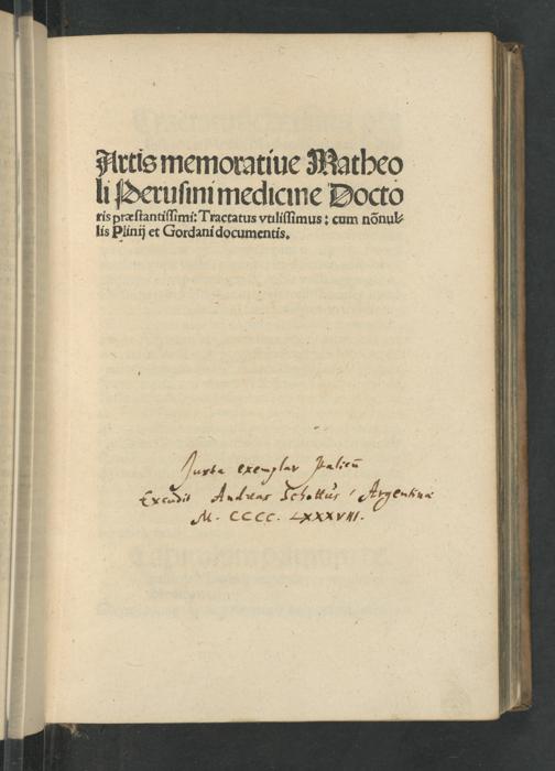 Artis memoratiue Matheoli Perusini medicine Doctoris præstantissimi : Tractatus vtilissimus: cum no[n]nullis Plinij et Gordani documentis