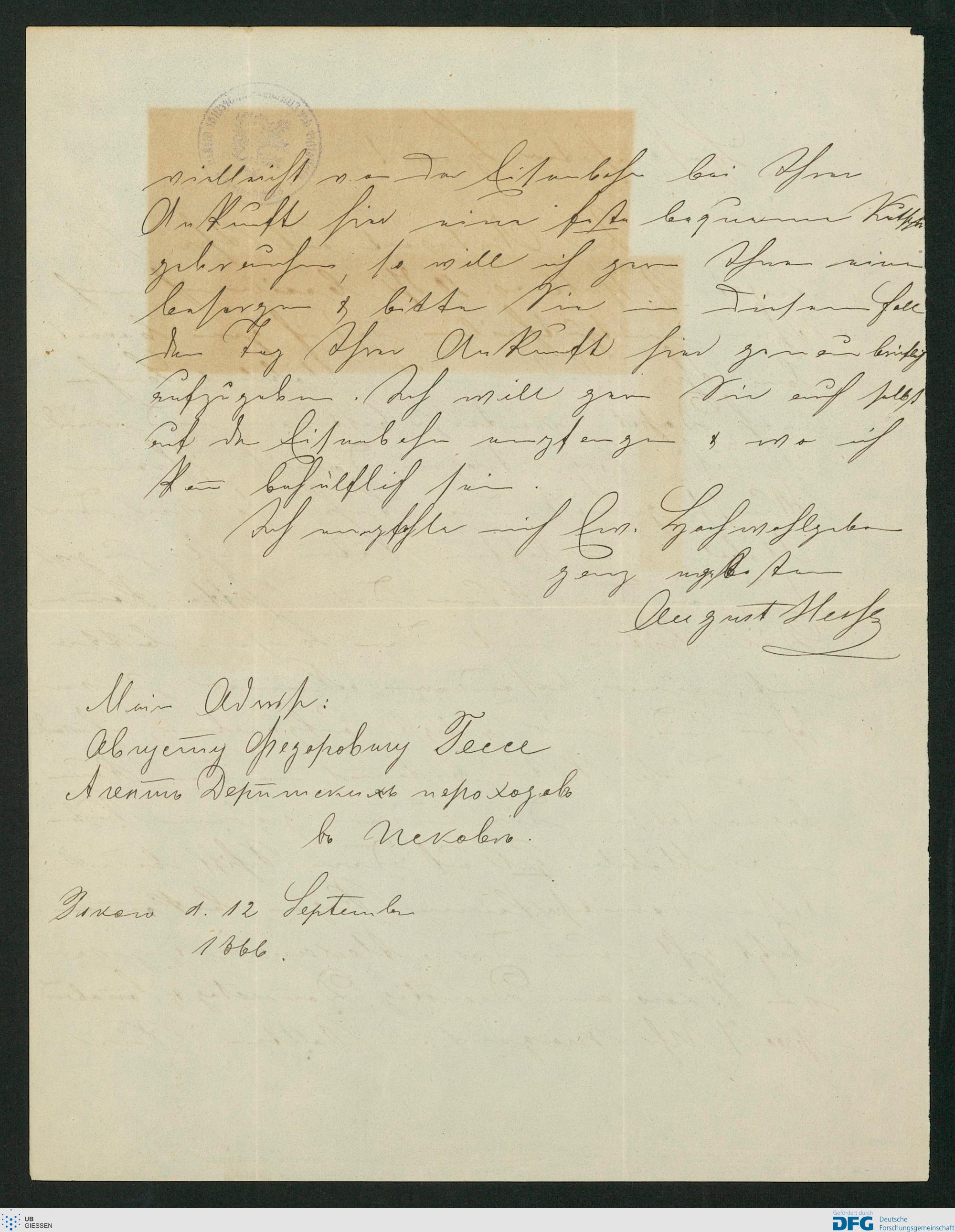 Brief von August Hesse an Karl Ernst von Baer, 12.09.1866 [12 September 1866]