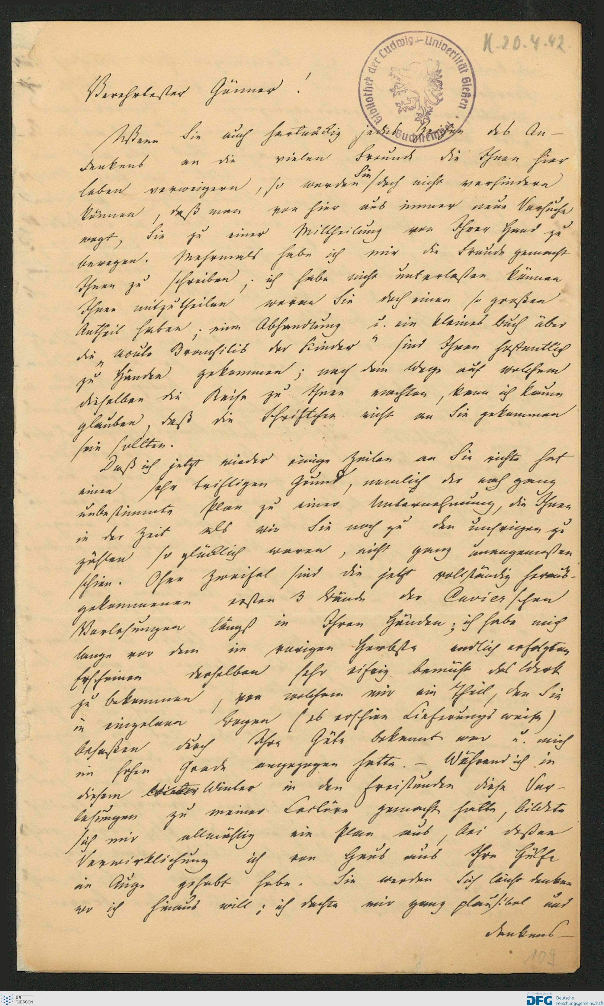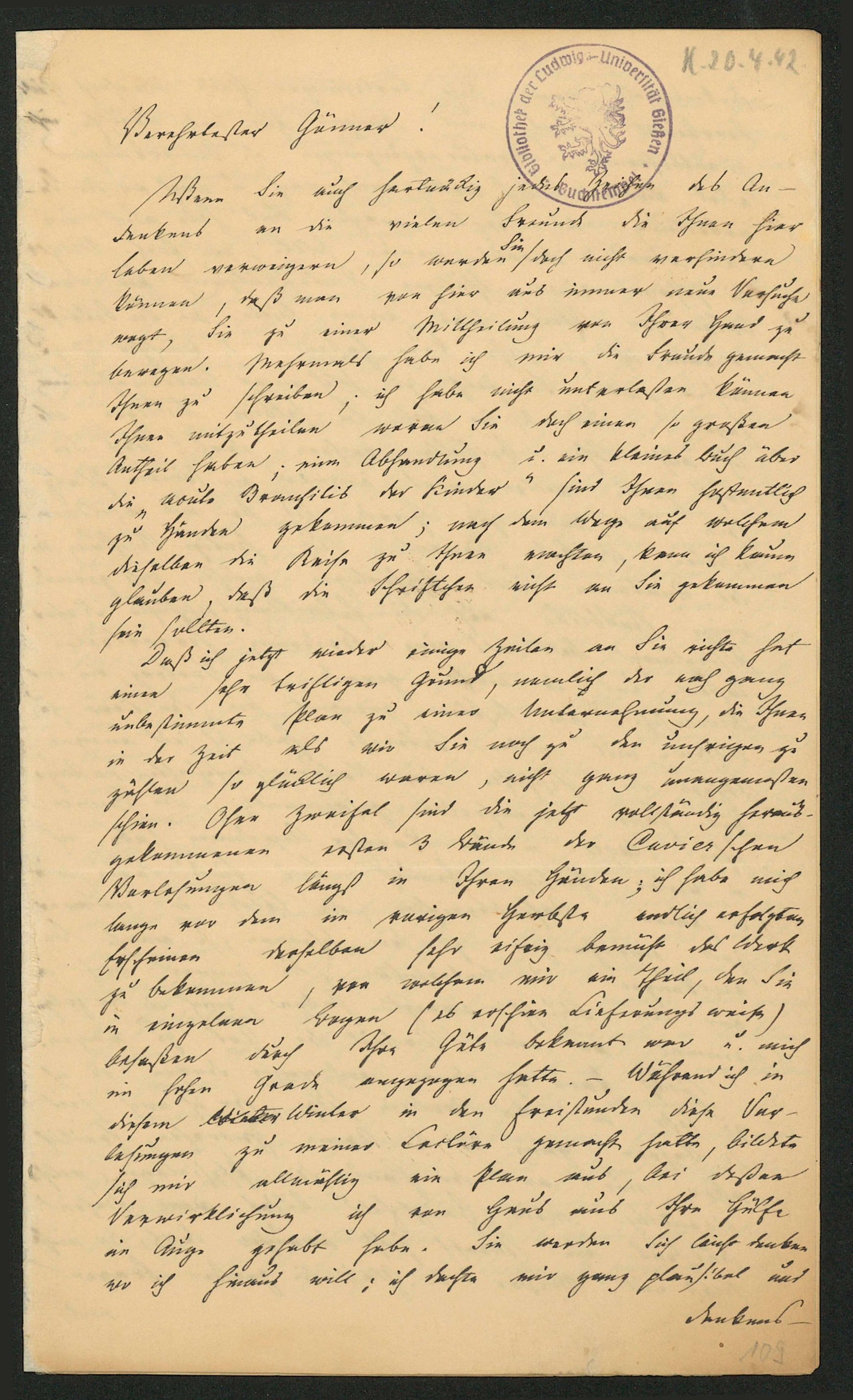 Brief von Karl Friedrich Wilhelm Cruse an Karl Ernst von Baer, 20.04.1842 [20 April 1842]