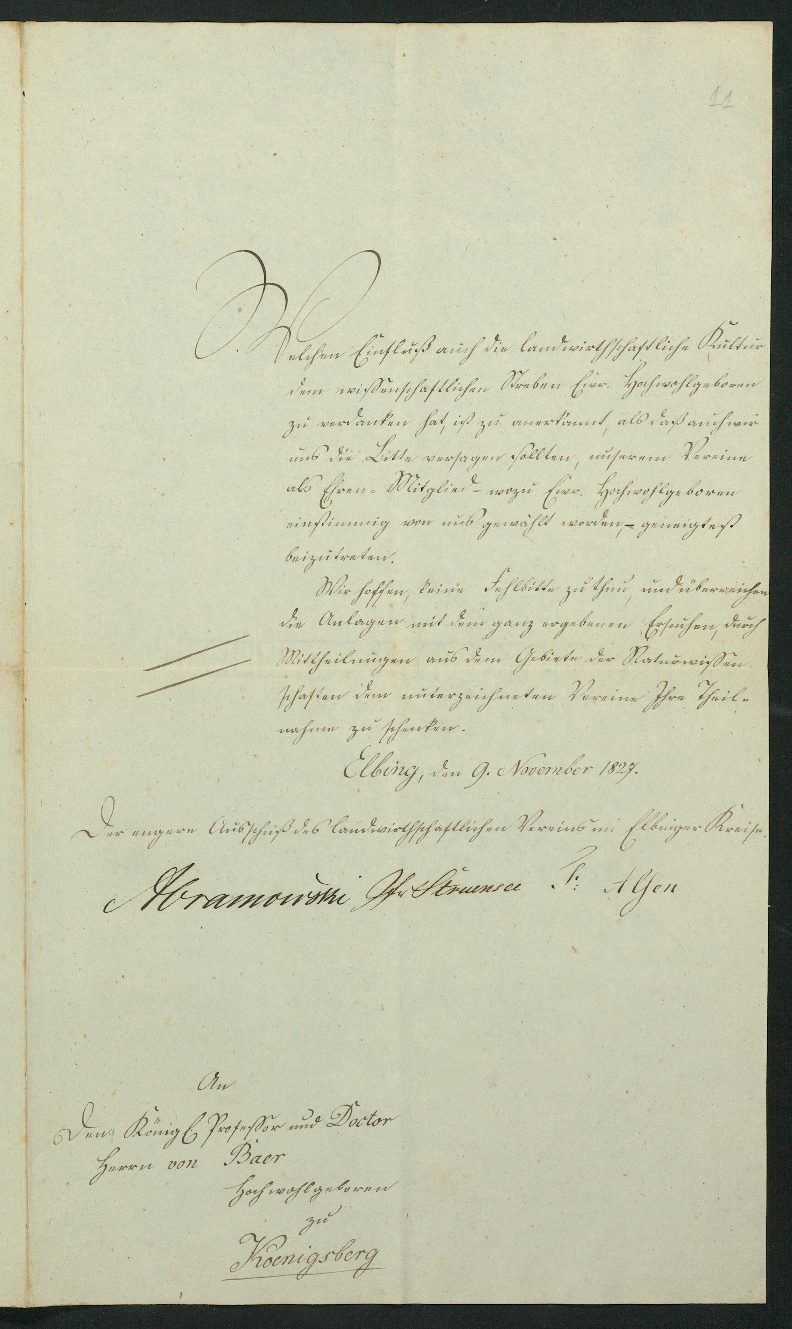 Brief von Karl Friedrich Abramowski, Gotthilf Christoph Struensee und Friedrich Alsen von Landwirthschaftlicher Verein (Elbing, Kreis) an Karl Ernst von Baer, 09.11.1827 [9. November 1827]