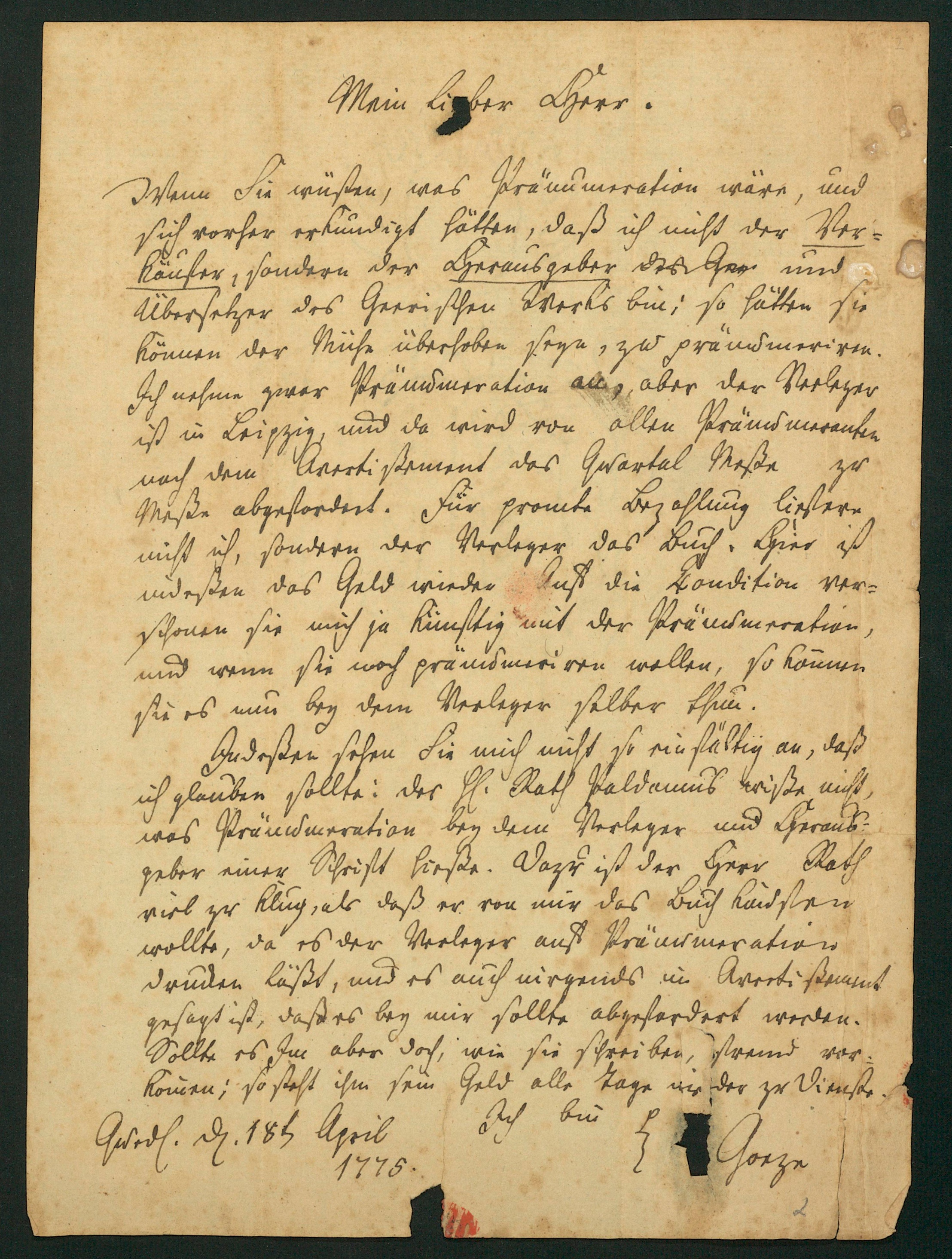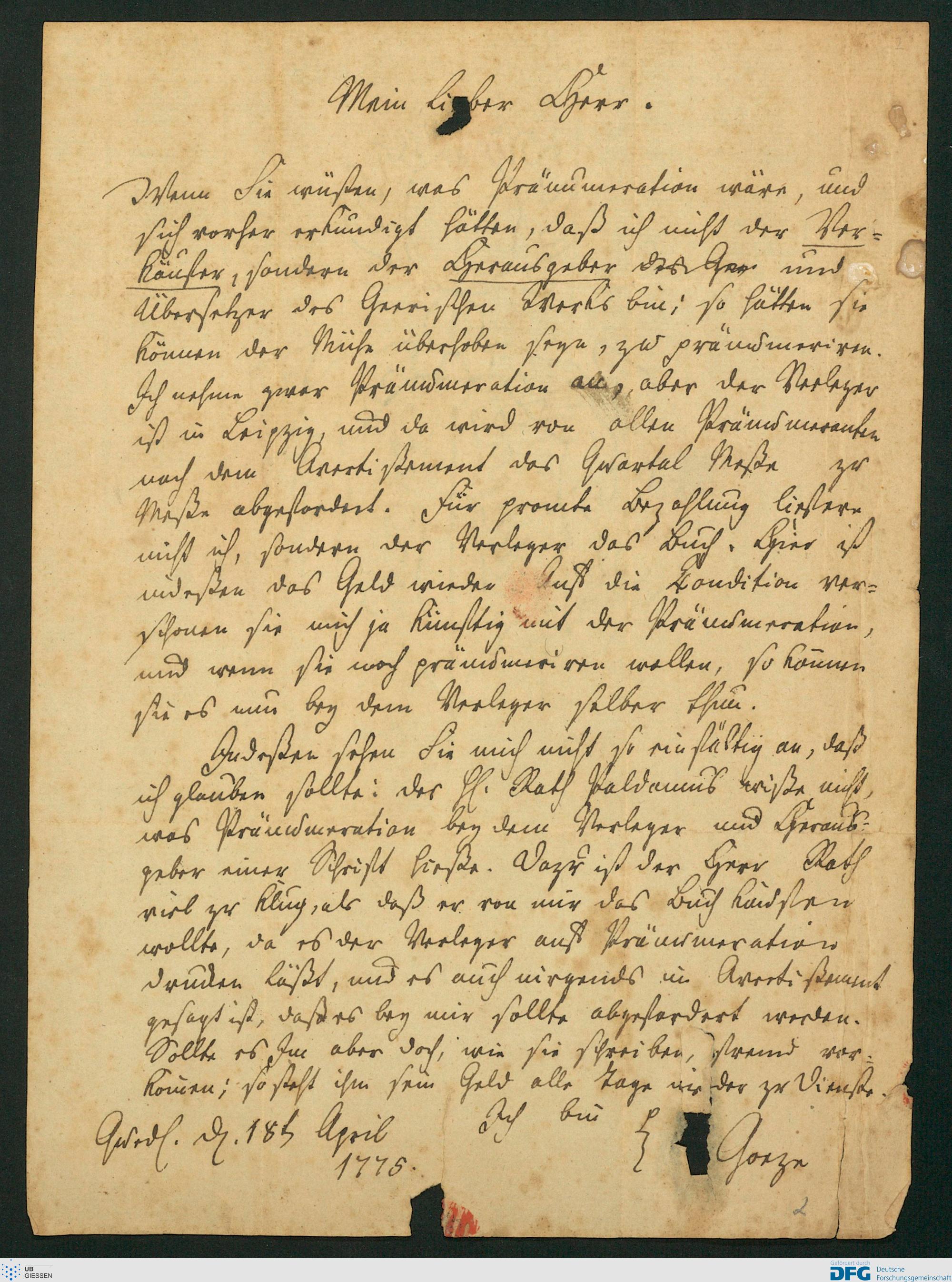 Brief von Johann August Ephraim Goeze an Georg Friedrich Ahrens, 18.04.1775 [18ten April 1775]