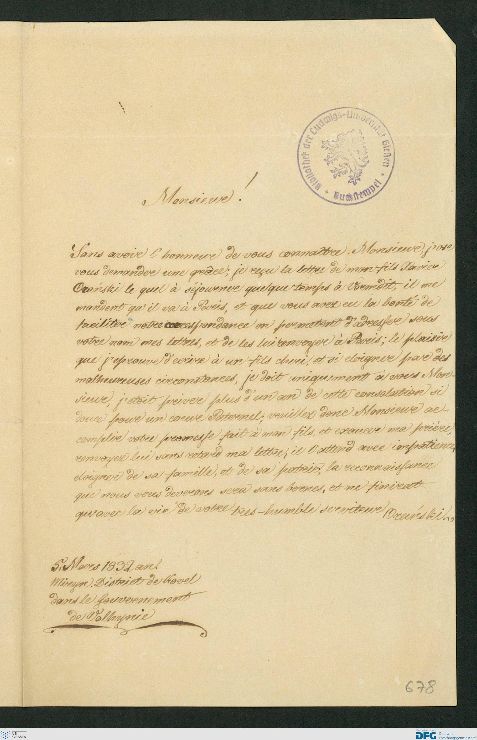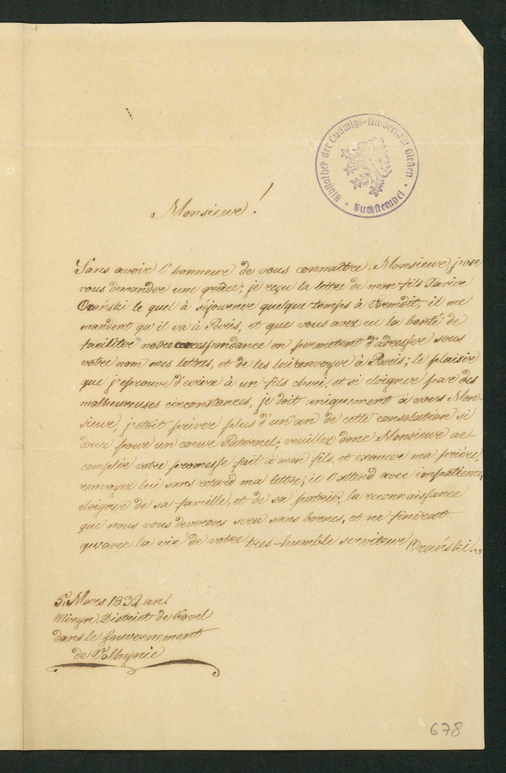 Brief von Orański an Karl Ernst von Baer, 05.03.1832 [5. Mars 1832 an]