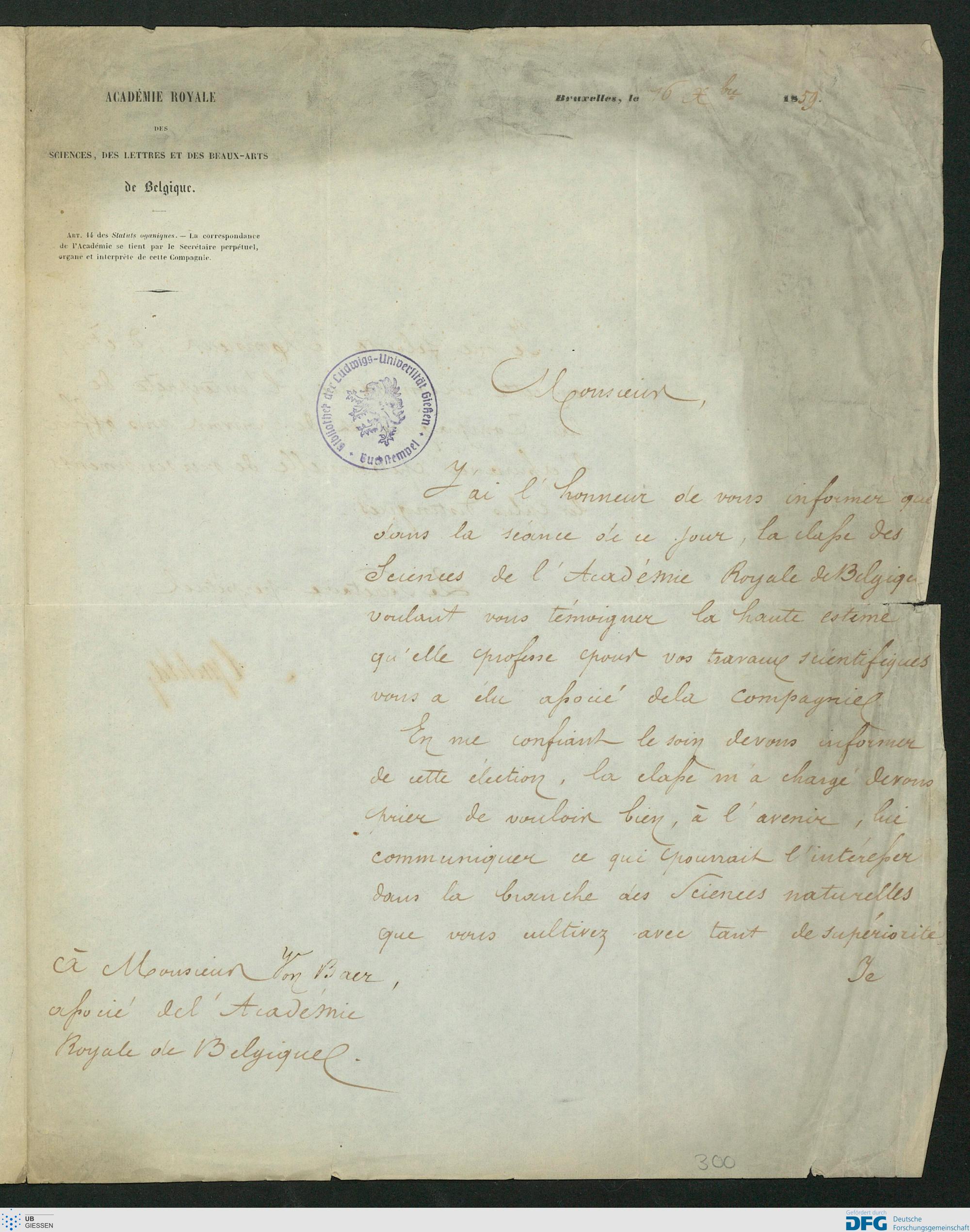 Brief von Adolphe Quételet von des lettres et des beaux-arts de Belgique Académie royale des sciences an Karl Ernst von Baer, 16.12.1859 [16 Xbre 1859]