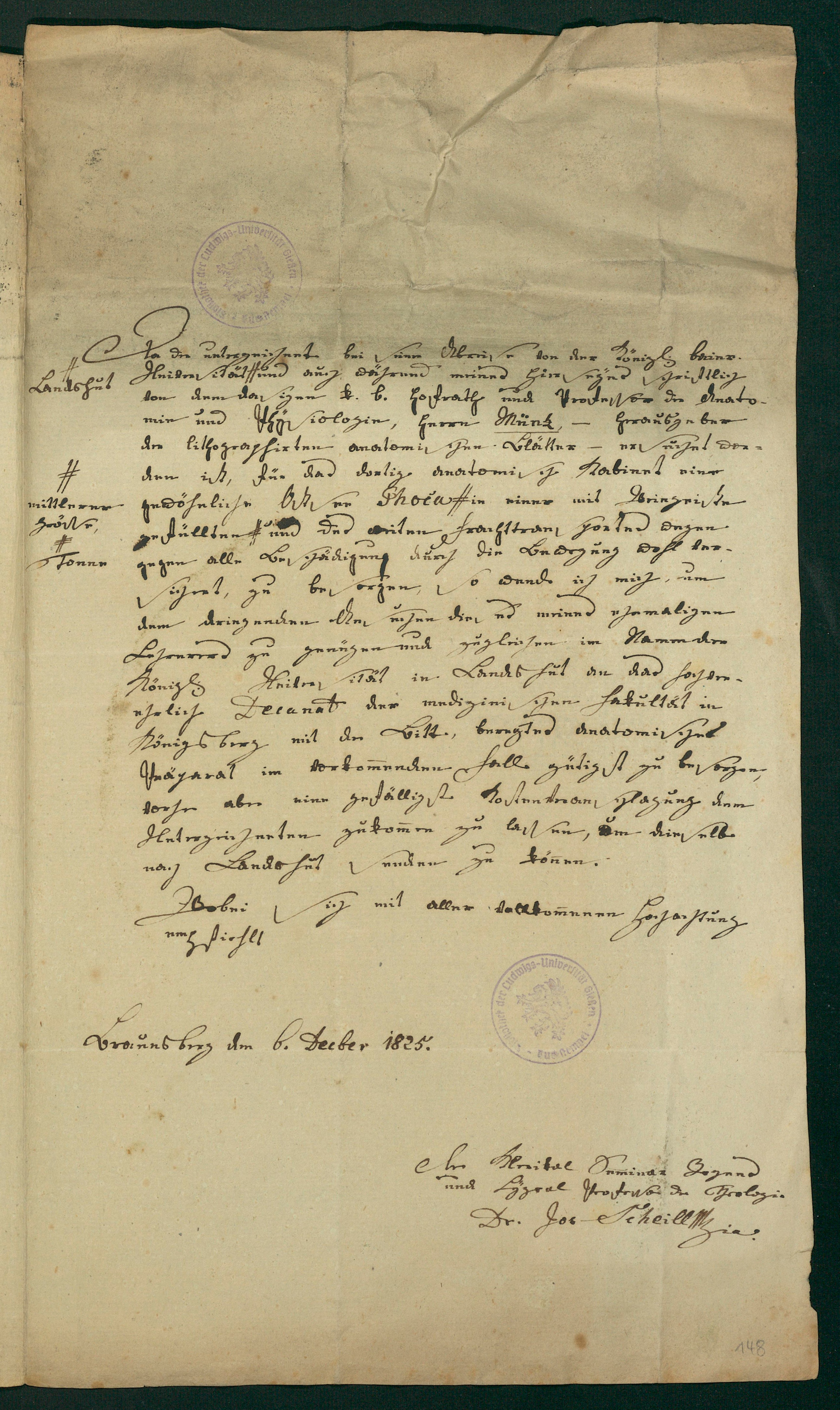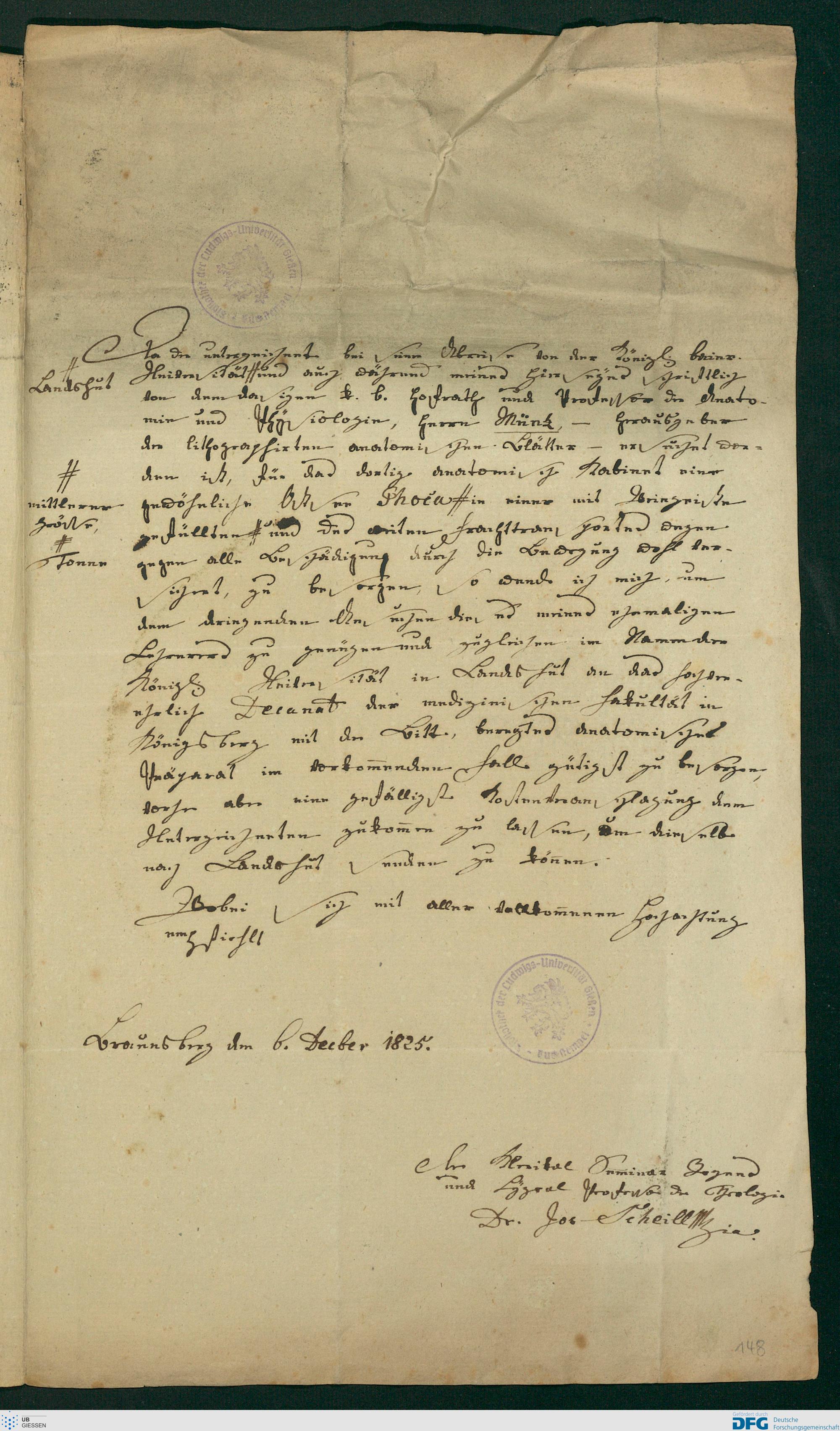 Brief von Joseph Scheill an Universität / Medizinische Fakultät / Dekanat (Königsberg), 06.12.1825 [6. Decber 1825]