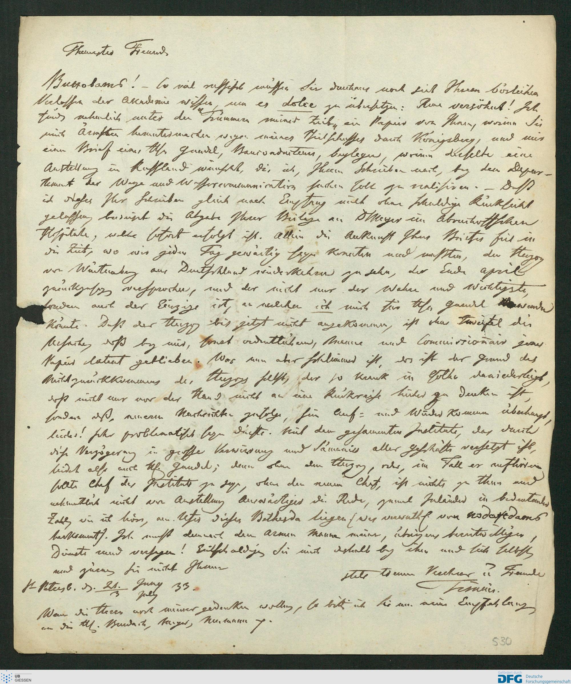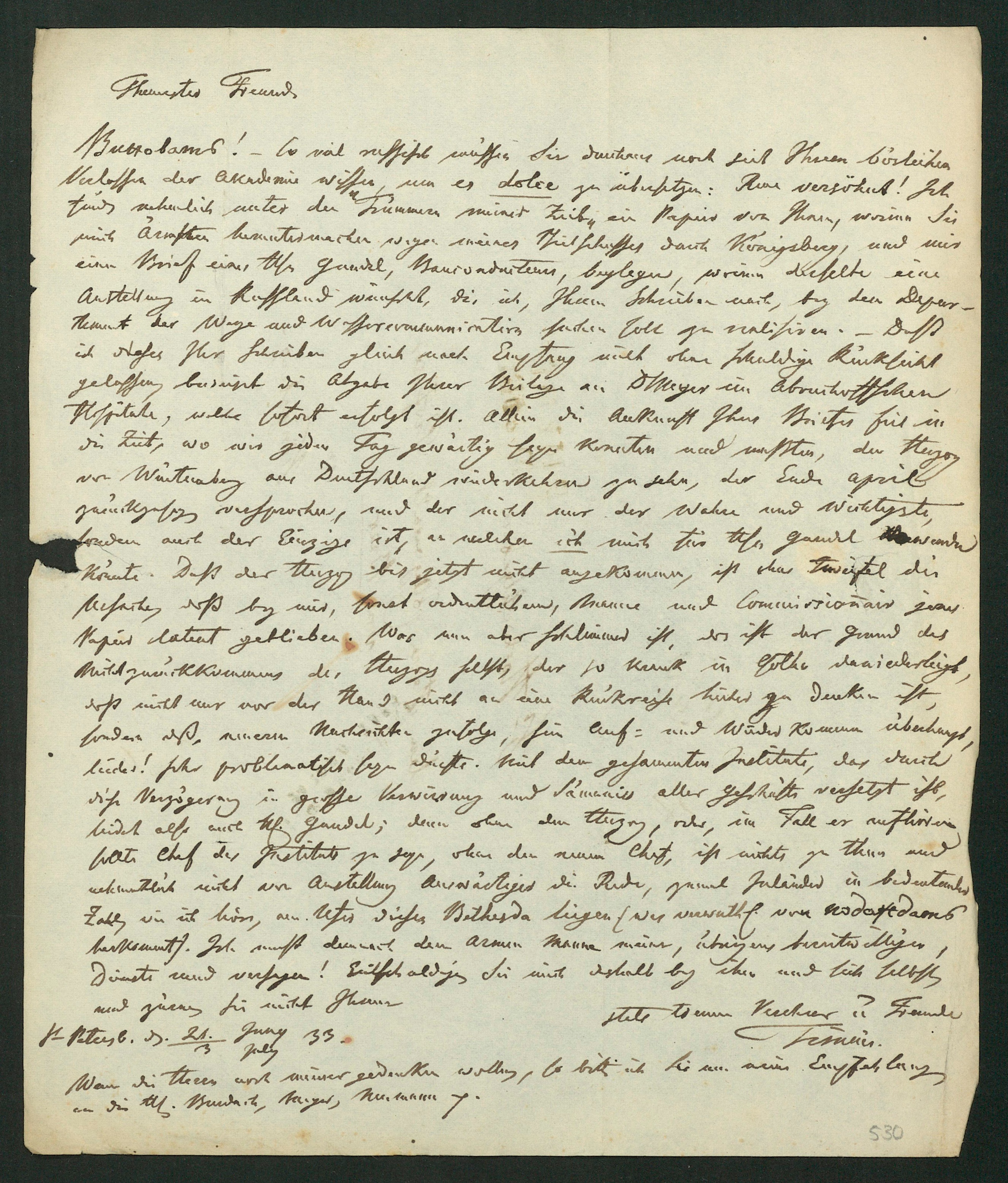 Brief von Karl Bernhard von Trinius an Karl Ernst von Baer, 21.06.1833-03.07.1833 [21. Juny/3 July 33 (Poststempel: MEMEL 10. JULI)]