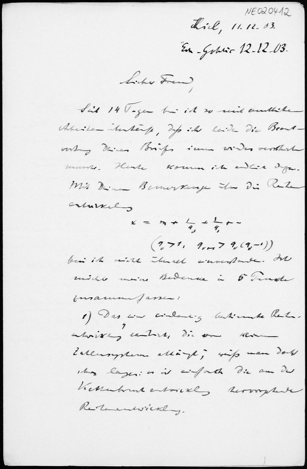 Brief von Paul Stäckel an Friedrich Engel vom 11.12.1903