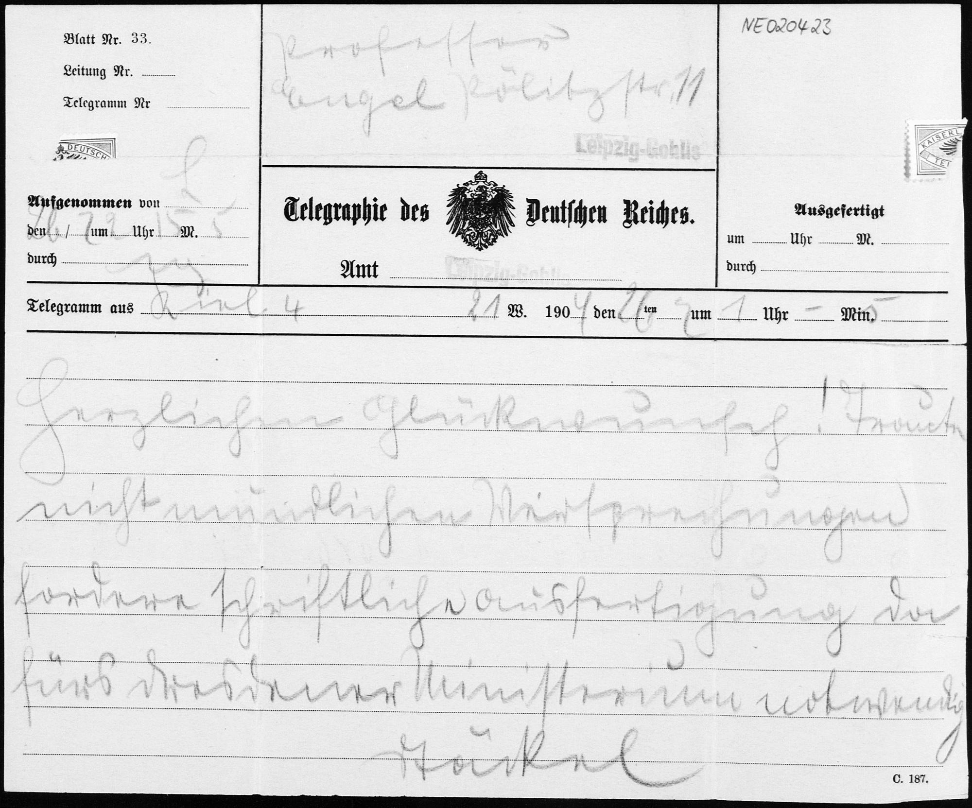 Telegramm von Paul Stäckel an Friedrich Engel vom 26.2.1904