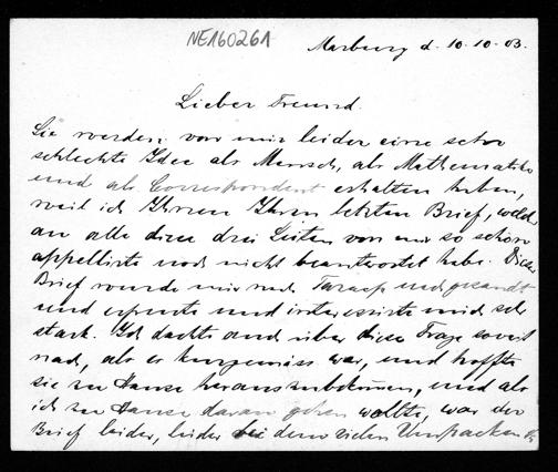 Briefkarte von Kurt Hensel an Friedrich Engel vom 10.10.1903