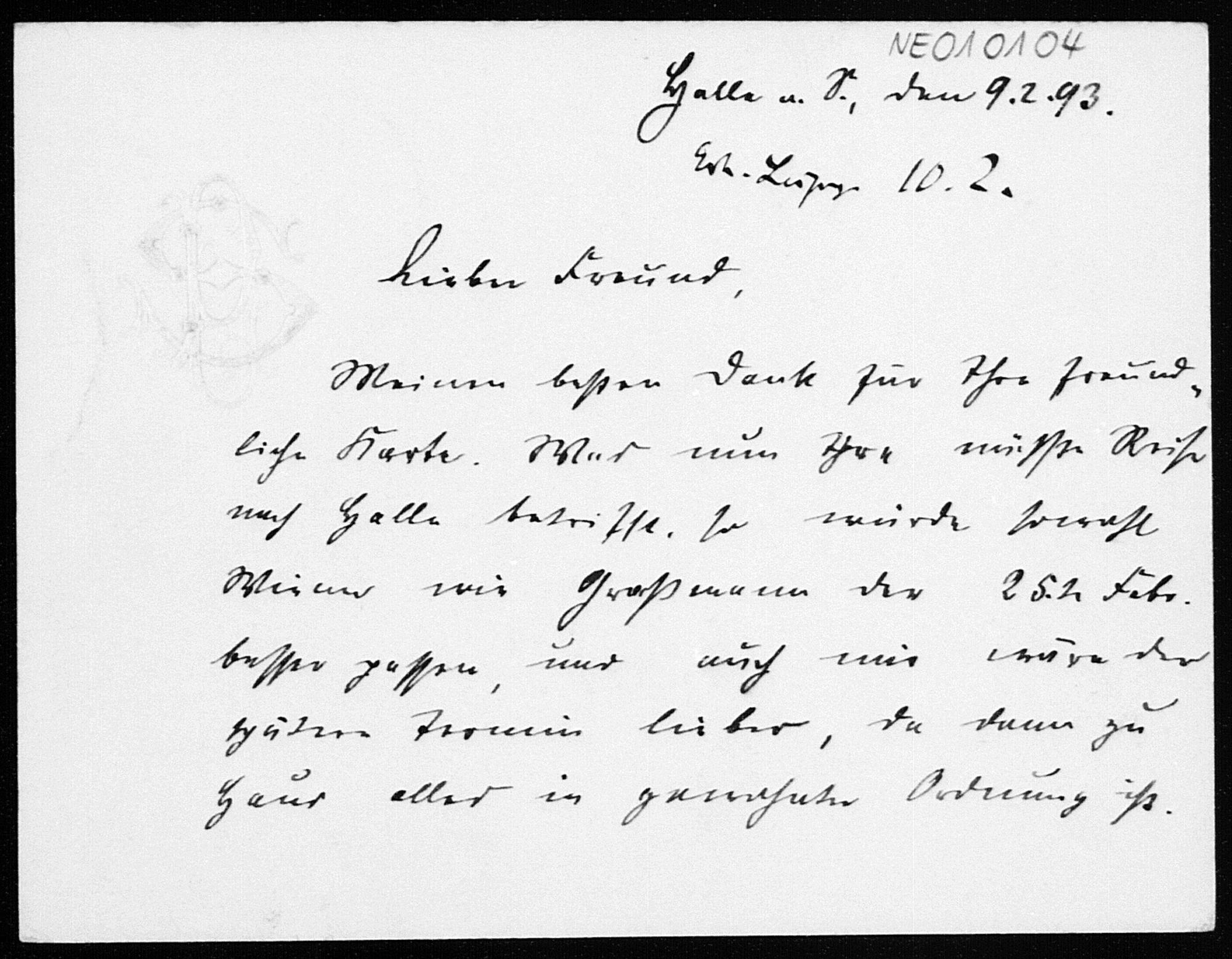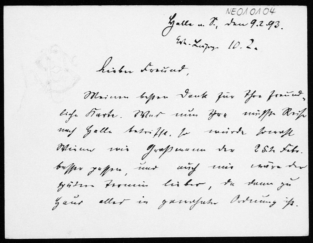 Briefkarte von Paul Stäckel an Friedrich Engel vom 9.2.1893