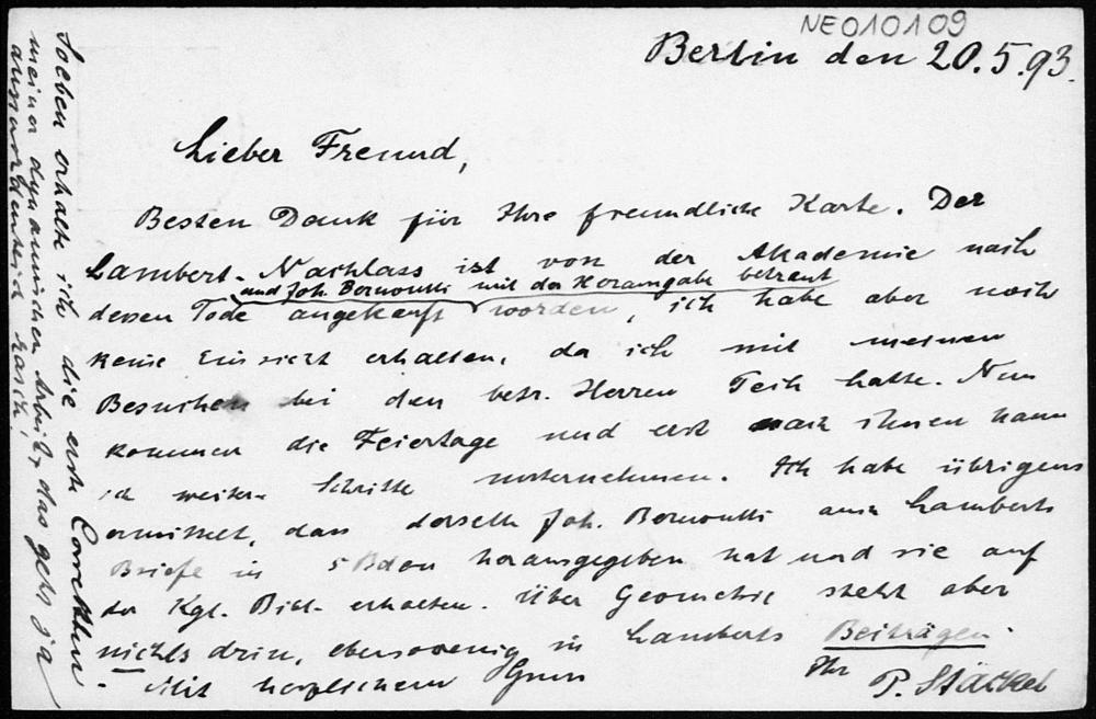 Postkarte von Paul Stäckel an Friedrich Engel vom 20.5.1893