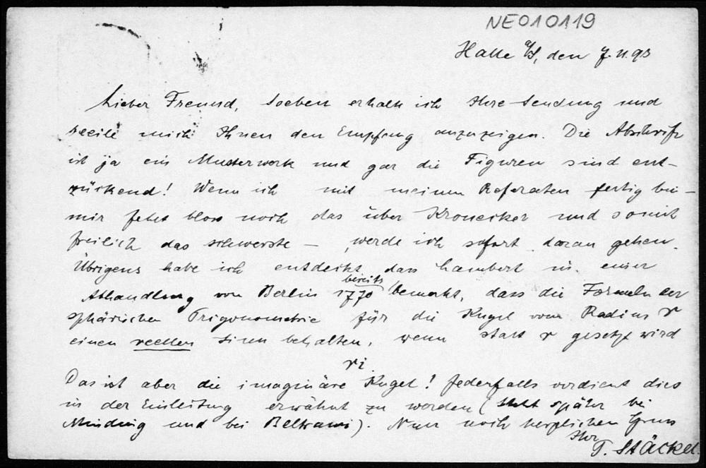 Postkarte von Paul Stäckel an Friedrich Engel vom 7.11.1893