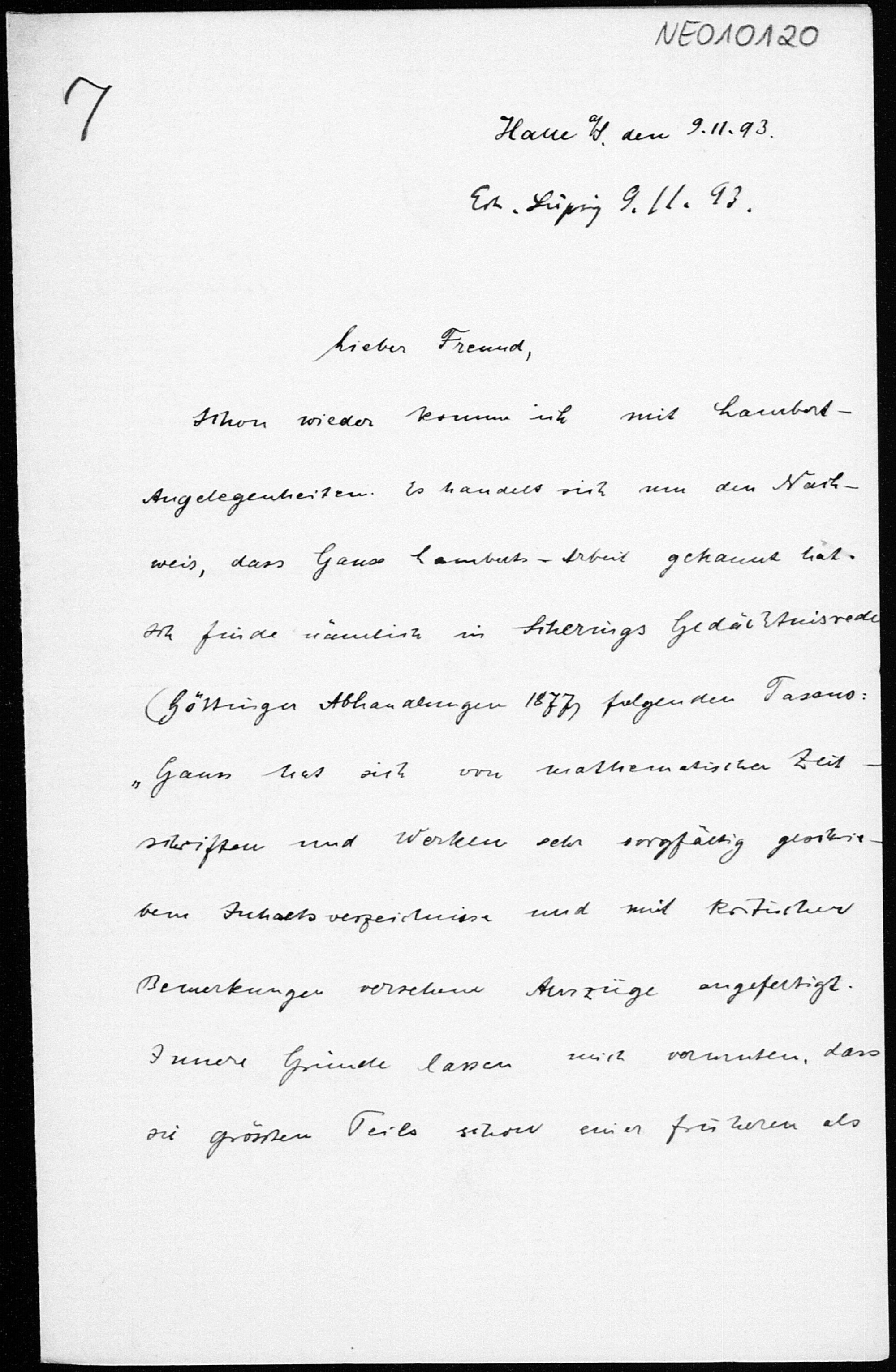 Brief von Paul Stäckel an Friedrich Engel vom 9.11.1893