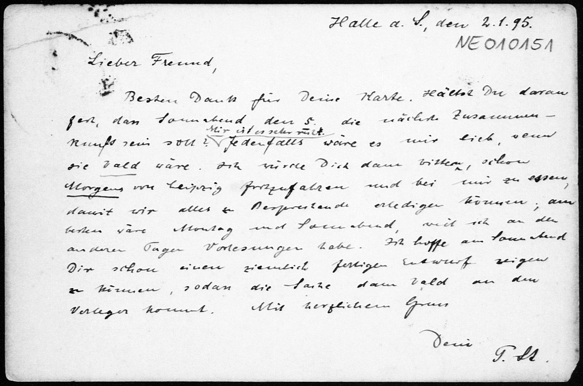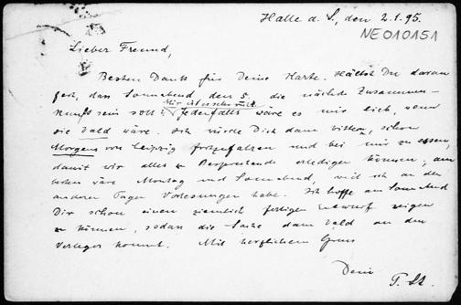 Postkarte von Paul Stäckel an Friedrich Engel vom 2.1.1895