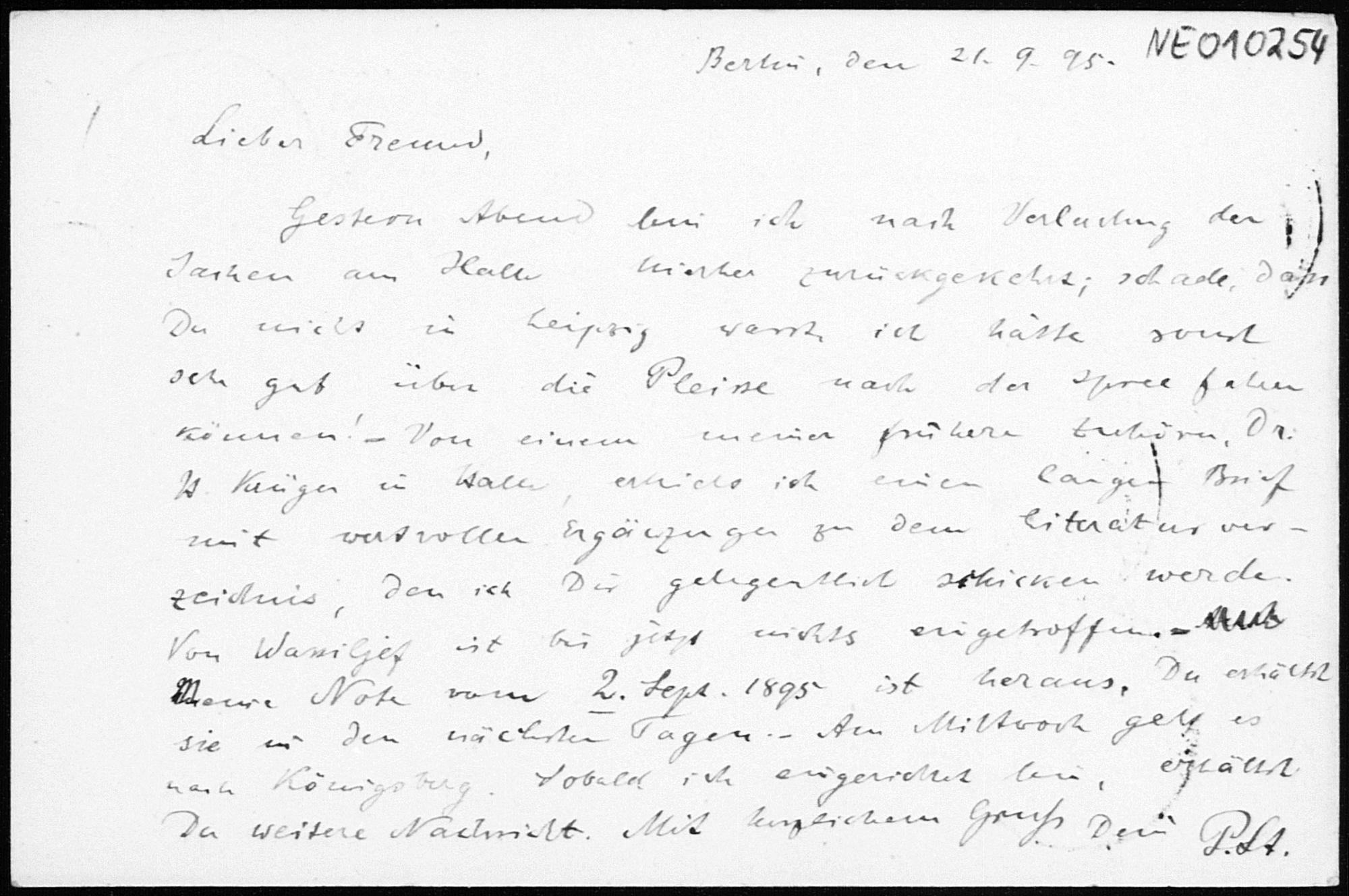 Postkarte von Paul Stäckel an Friedrich Engel vom 21.9.1895