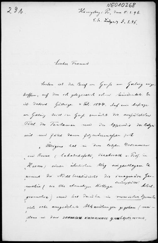 Brief von Paul Stäckel an Friedrich Engel vom 8.1.1896