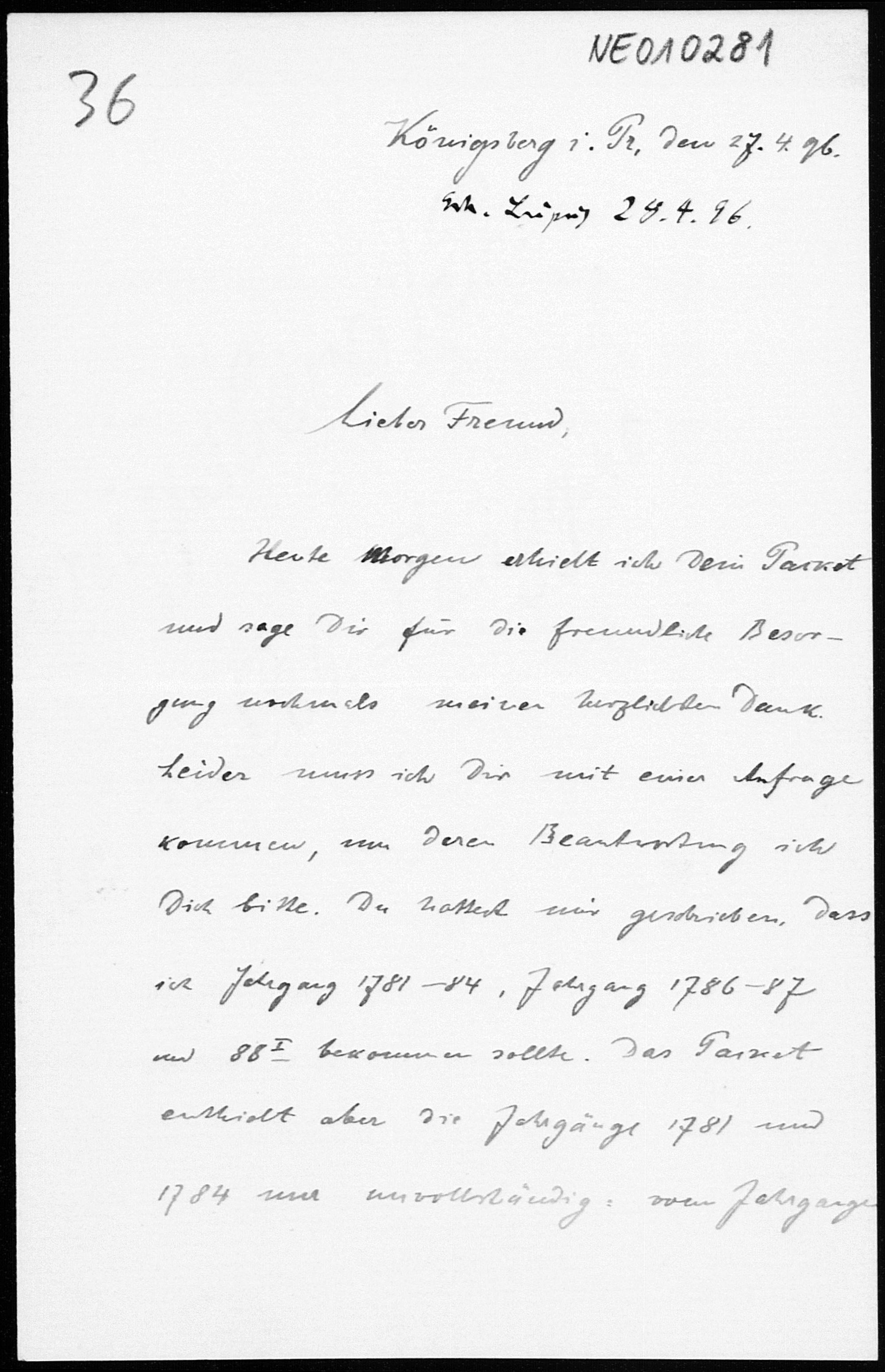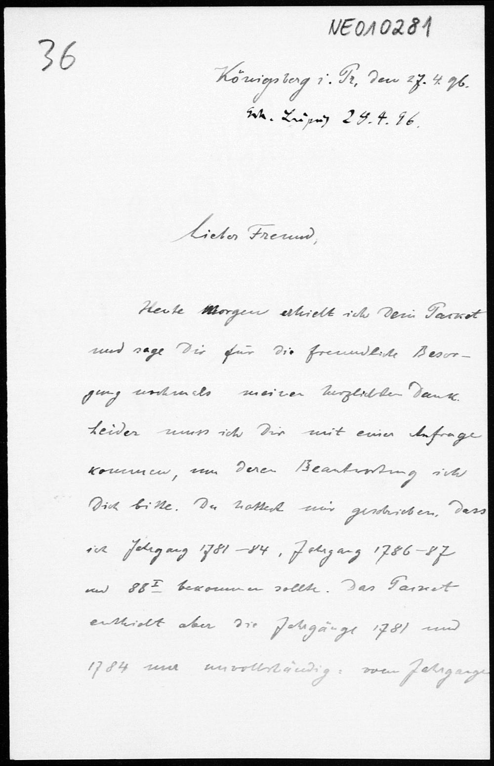Brief von Paul Stäckel an Friedrich Engel vom 27.4.1896