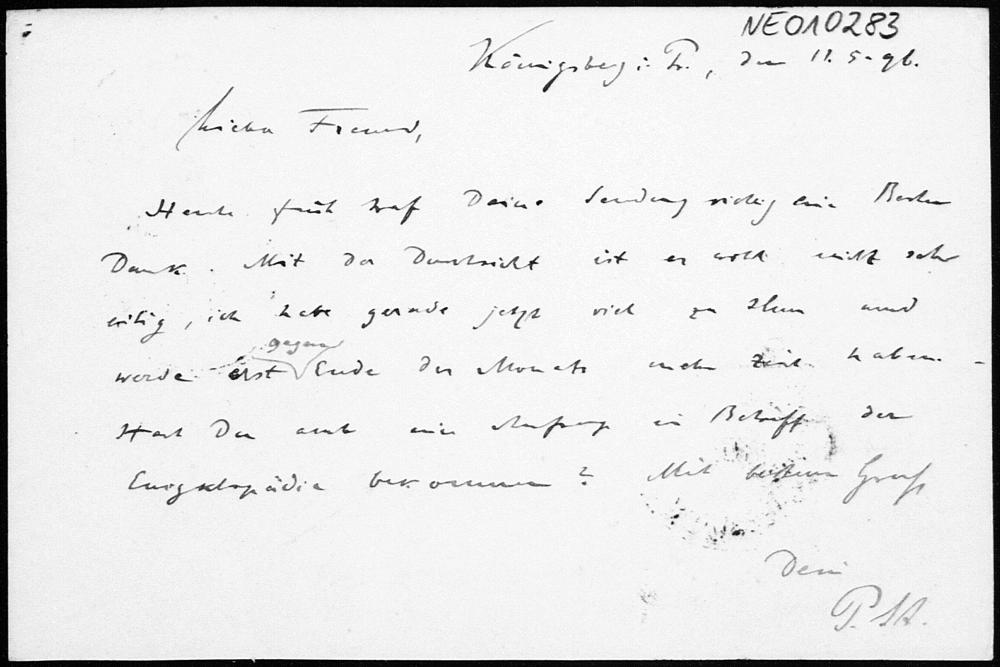 Postkarte von Paul Stäckel an Friedrich Engel vom 11.5.1896