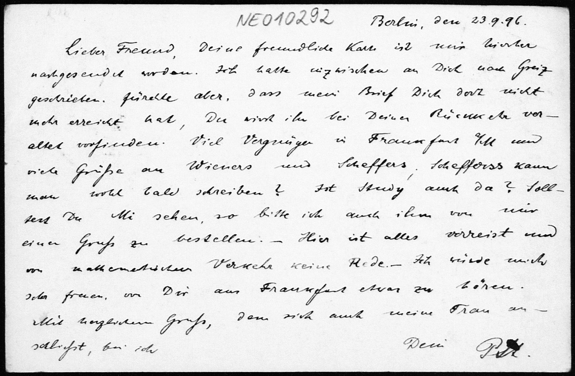 Postkarte von Paul Stäckel an Friedrich Engel vom 23.9.1896